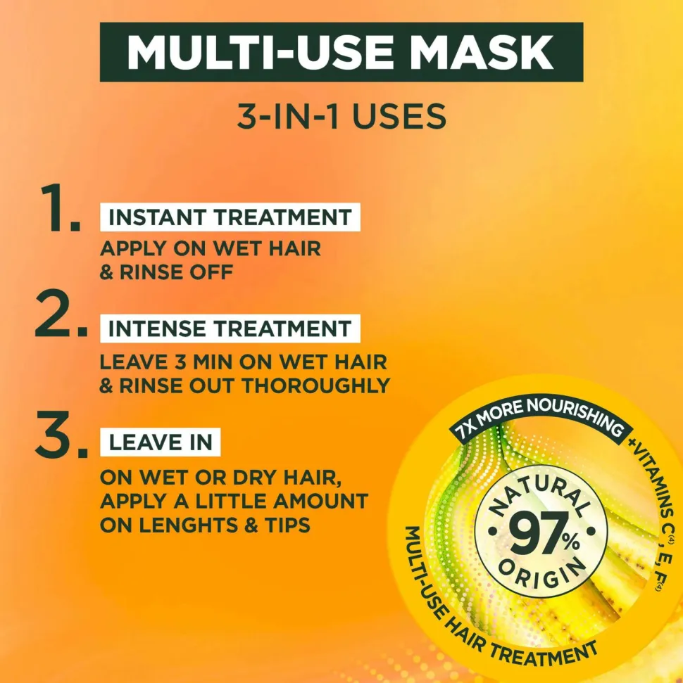 “Garnier Fructis Hair Food Banana Multi-use Treatment er en hårmaske til tørt hår som nærer intenst samt gør håret blødt og nemt at rede ud. Resultatet? 7x mere næret hår*! Den veganske formel** er beriget med omega 6 og 9 samt vitamin C + F-derivater og E-vitamin.
