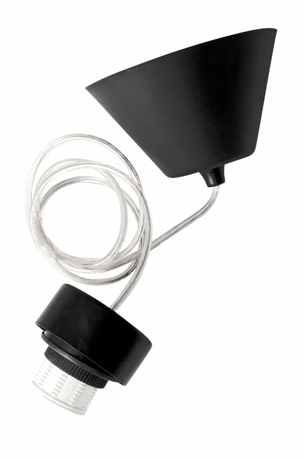 Ophæng E27 med gevindfatning og sortfarvet ring. 120 cm transparent 3-lederledning med baldakin. Indvendig diameter af ring 7 cm. Ujordet.