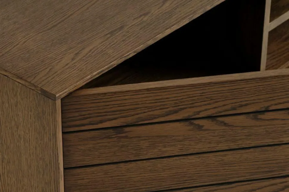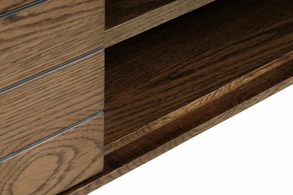 Eg i en varm, røget tone, der leger med udskårne, vandrette, lige linjer og industrielle strejf af sort metal giver Modica en let fornemmelse, i et design forstærket af skufferne og lågerne med tryk-og-åbn-system.