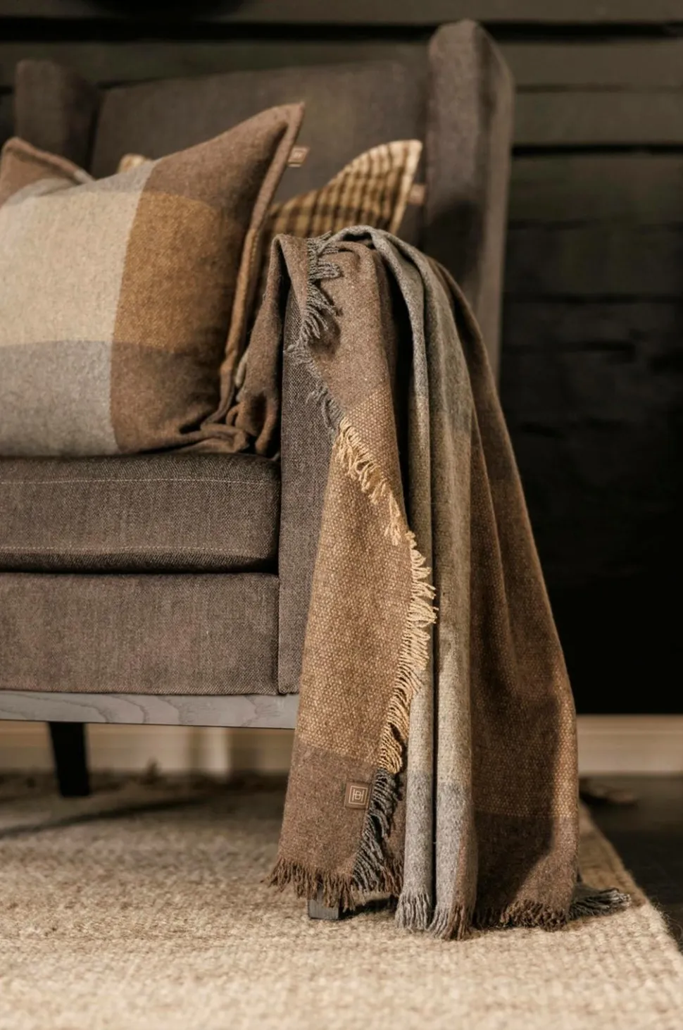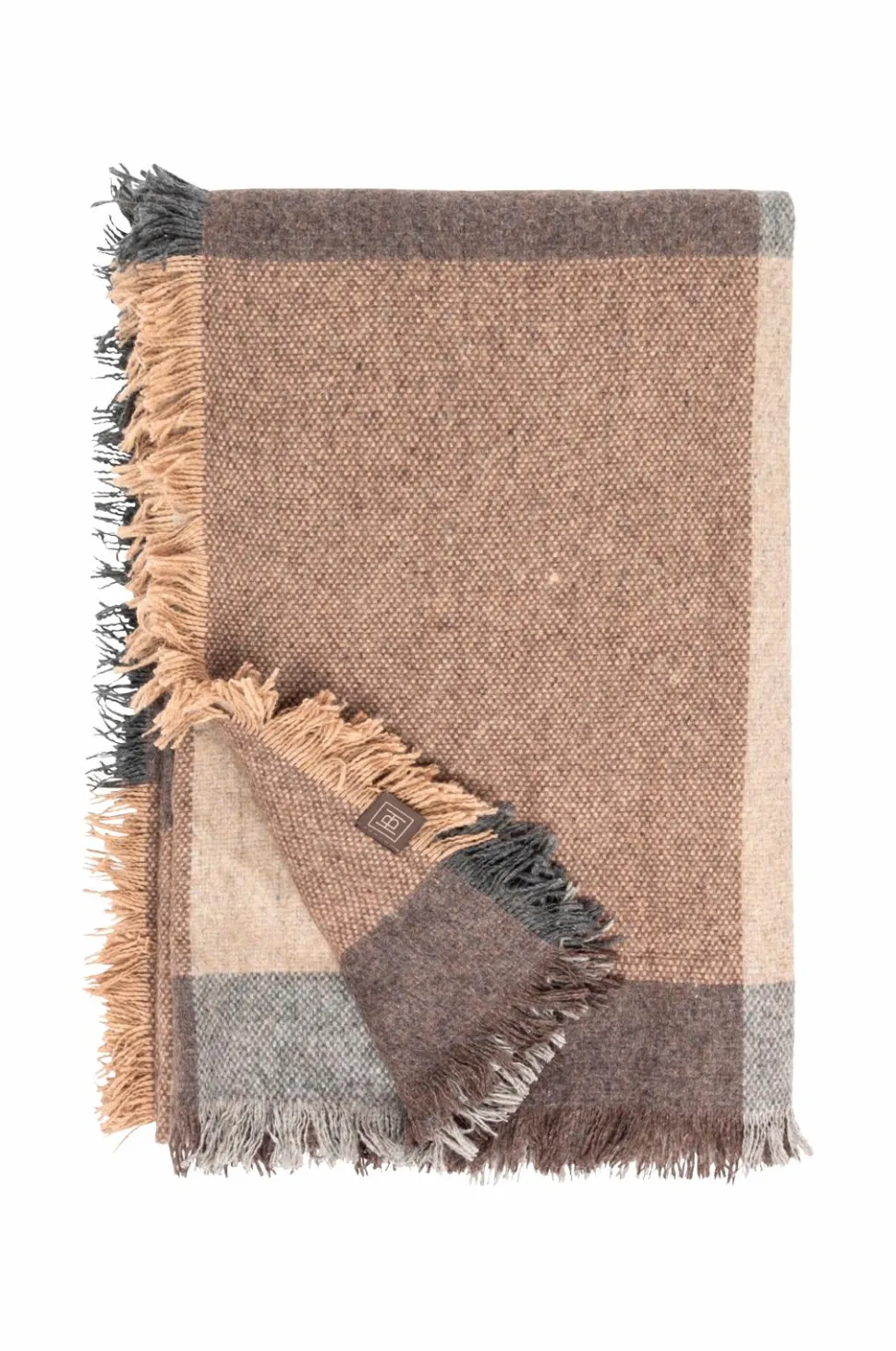Lækkert uldtæppe med store firkanter i brune, beige og grå nuancer. Uld er et åndbart materiale, hvilket gør uldplaider behagelige at bruge året rundt. Plaiden har frynser på alle sider. Materiale: 65 % uld og 35 % andre fibre. Størrelse: b120 x l200 cm. Frynser på alle sider. Plaiden er en del af Halvor Bakkens kollektion