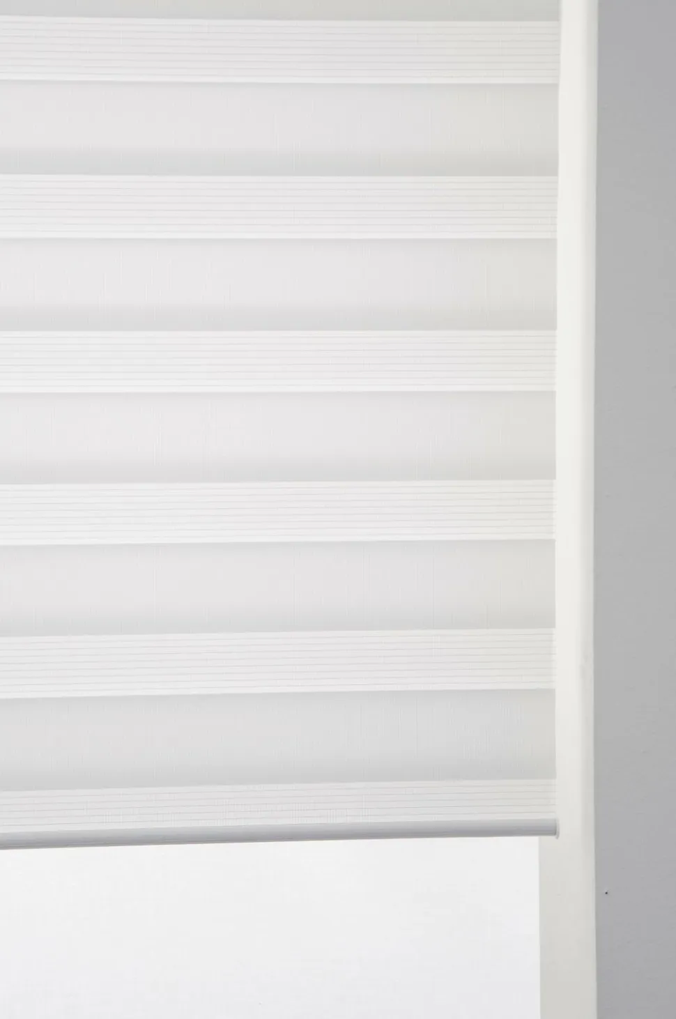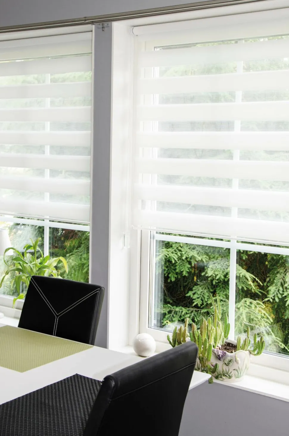 En dobbelt rullegardin med dækkende og transparente striber, der afhængigt af placeringen mod hinanden, slipper lys ind eller holder det ude.