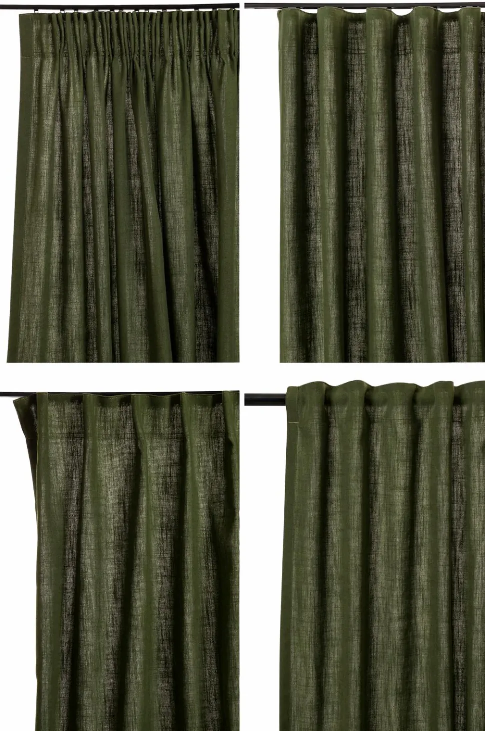 Gardin i rustik stil med linnedlook. Smart kombibånd med fire forskellige ophængningsmuligheder: direkte på stangen, med dybe plisseekroge, flæsekroge eller en moderne bølgestil. Gardinkroge medfølger ikke. En gardinlængde pr. pakke.