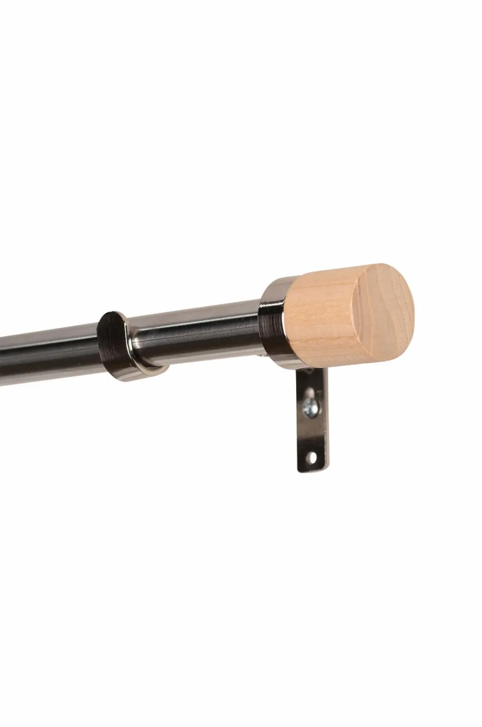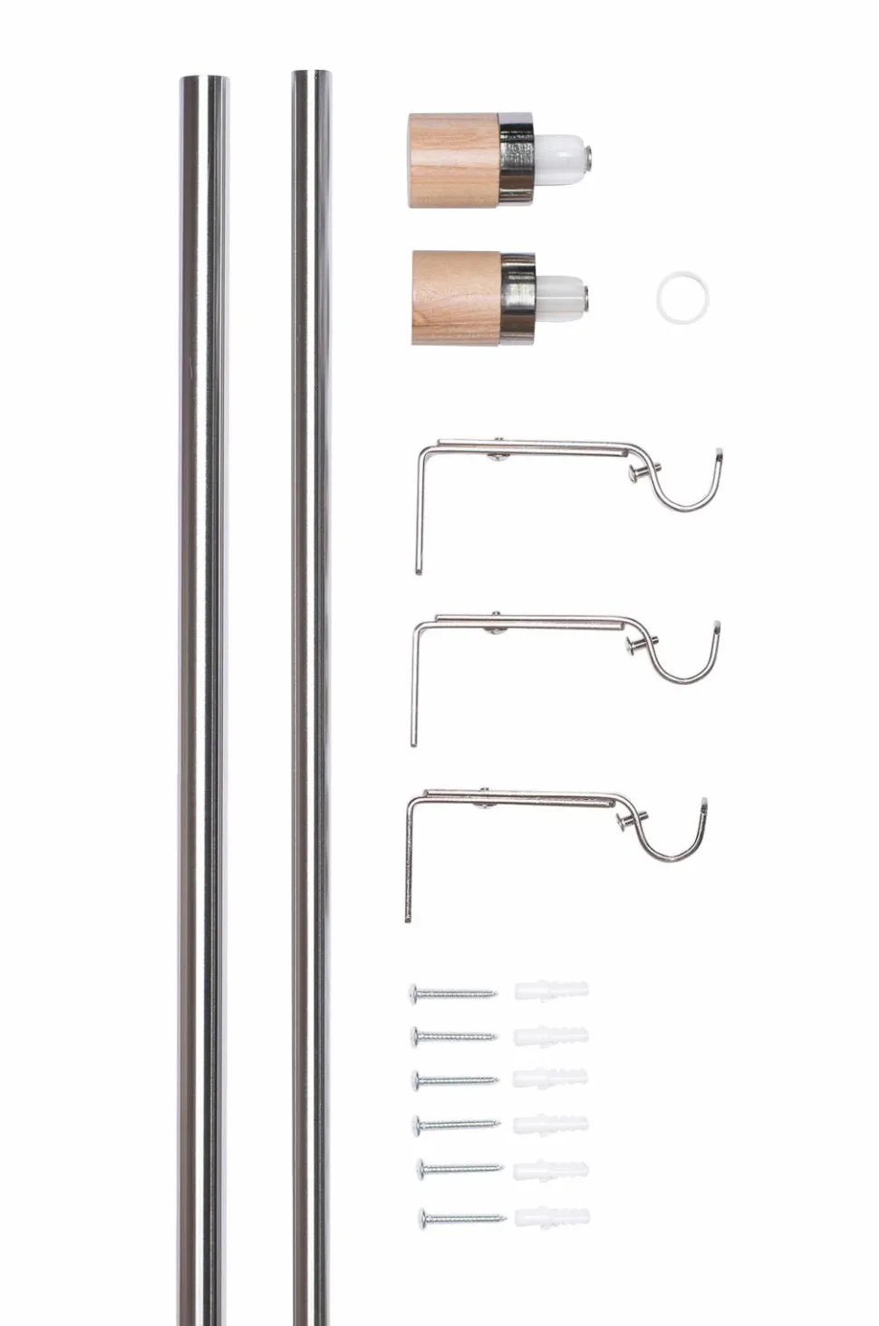 Komplet gardinstang i metal (16/19 mm) med dekorative finials i træ. Sættet indeholder justerbare stænger (110-200 cm), 2 finials og 3 justerbare vægbeslag (7-9 cm).