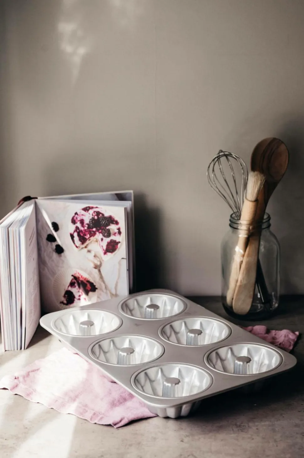 Bageform i støbt aluminium, der skaber seks kager i portionsstørrelse.