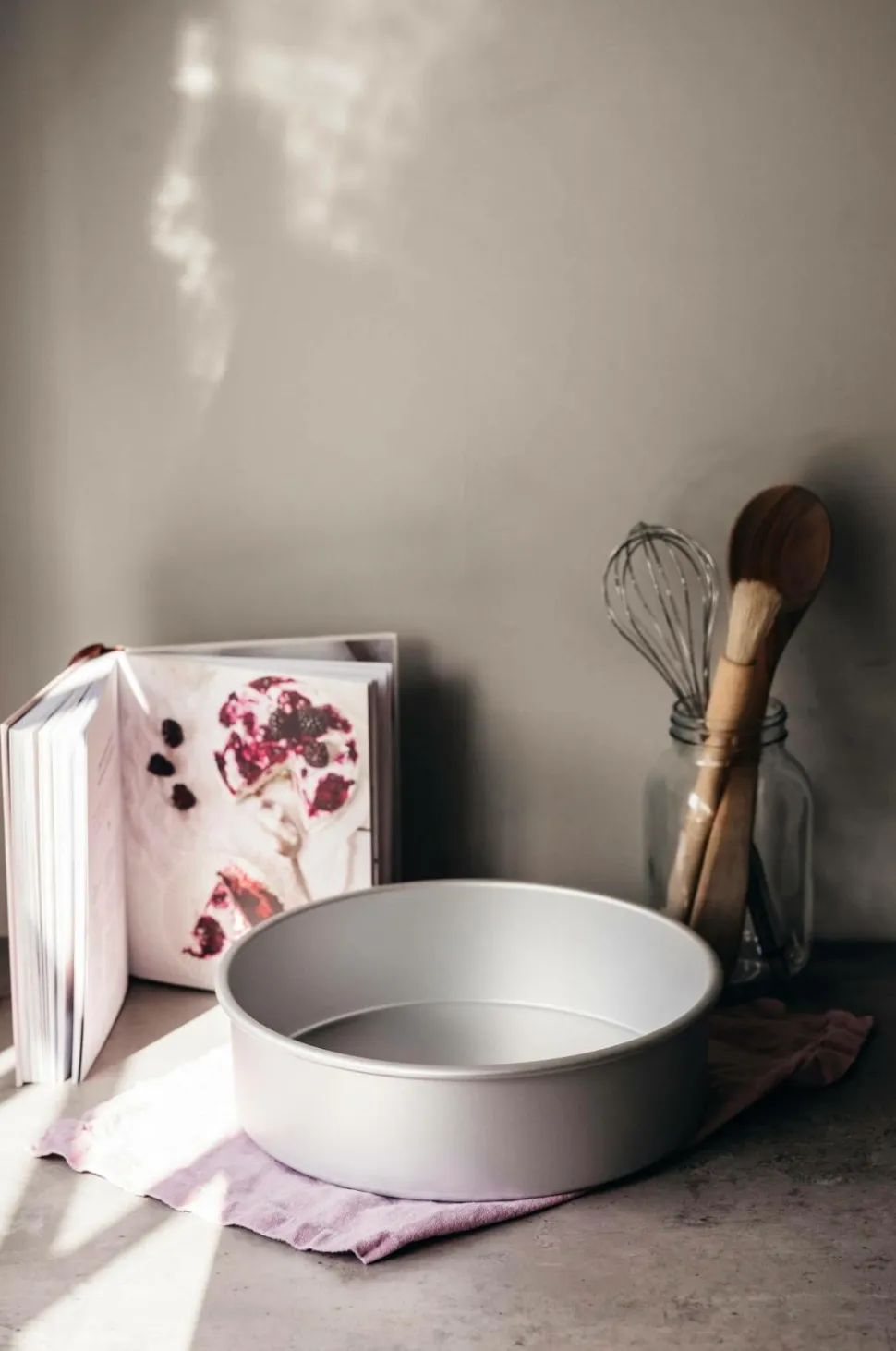 Rund bageplade af anodiseret aluminium. Aluminium giver fremragende varmeledning og et jævnt resultat. Panden er 7,5 cm høj og har en kapacitet på 3,3 liter.