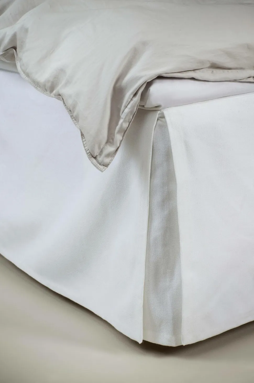 Weeknight Sengekjolen er lavet i en lidt tungere kanvas i halvlinned og med enkle syninger for et rent, tidløst look. Sengenederdelen fås i fire bredder, fra 90 cm til 180 cm, og selve nederdelen fås i to højder, 42 cm og 52 cm. Farverne er hvid og ask. Plej dit sengenederdel ved at lufte det udenfor, når det er nødvendigt. Små pletter kan behandles med varmt vand og pletfjerningsmiddel til tekstiler, alternativt opvaskemiddel eller vaskemiddel. Brug kemisk rensning til hårdere pletter. Renseri