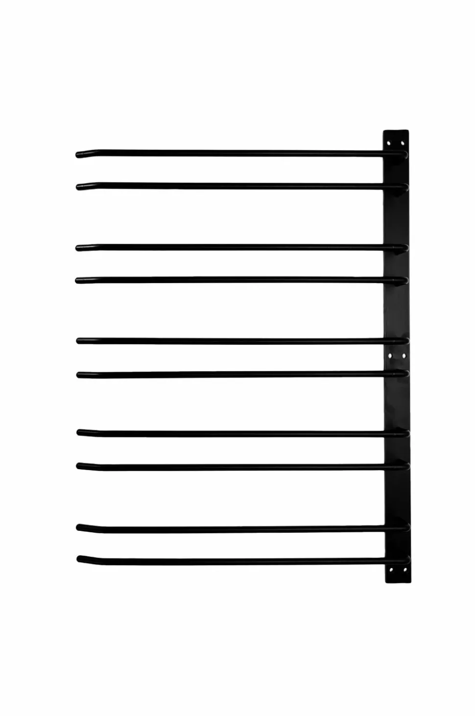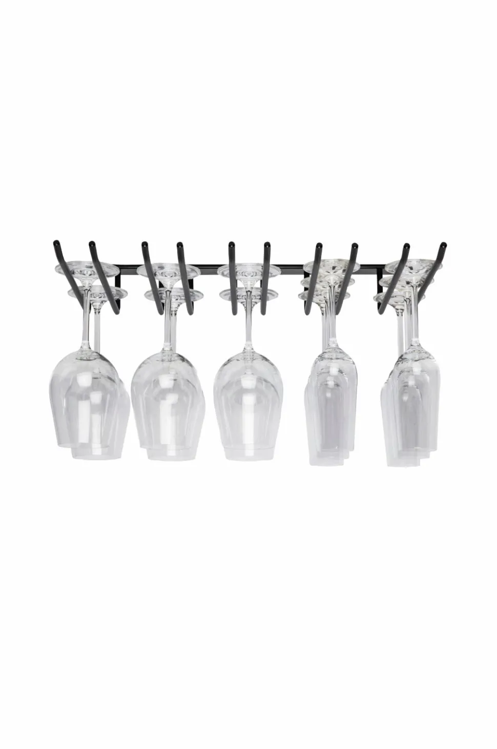 Sort glasophæng i barstil med fem rækker til loftmontering, et slankt sort glasophæng til loftmontering, 300 mm dybt og med plads til 15 glas. Bredde: 55 cm, total dybde inkl. plade: 32 cm, højde: 4 cm.