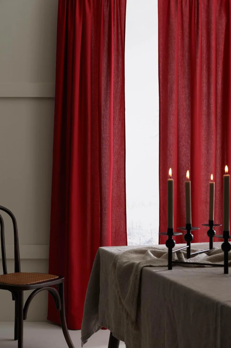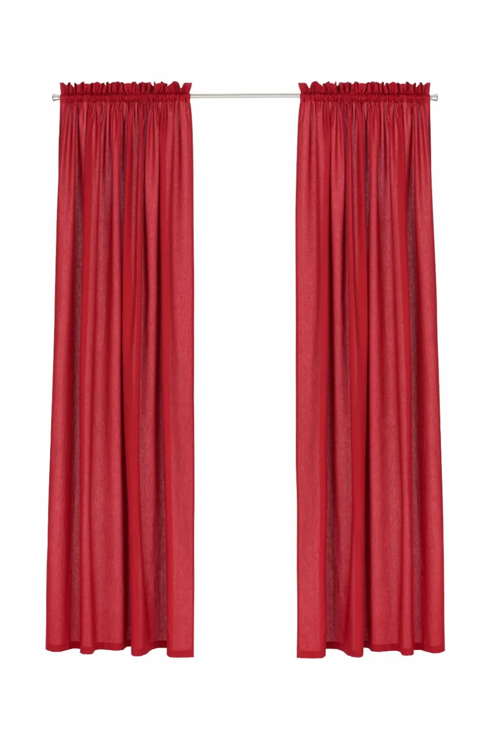 To gardiner af et lidt kraftigere stof i halvpanama af ren bomuld. Syet løbegang foroven. Bredde 145 cm. Tre længder: 160, 220 og 250 cm.