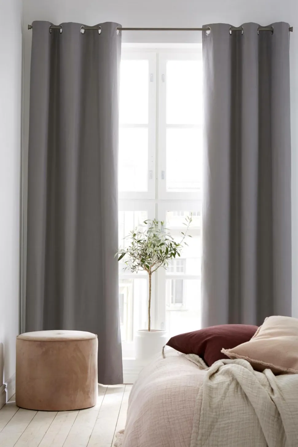 Gardinlængder med sejlringe giver et flot fald. Du vælger selv hvor store folderne i stoffet skal være, det afhænger af hvor meget du trækker gardinet ud.