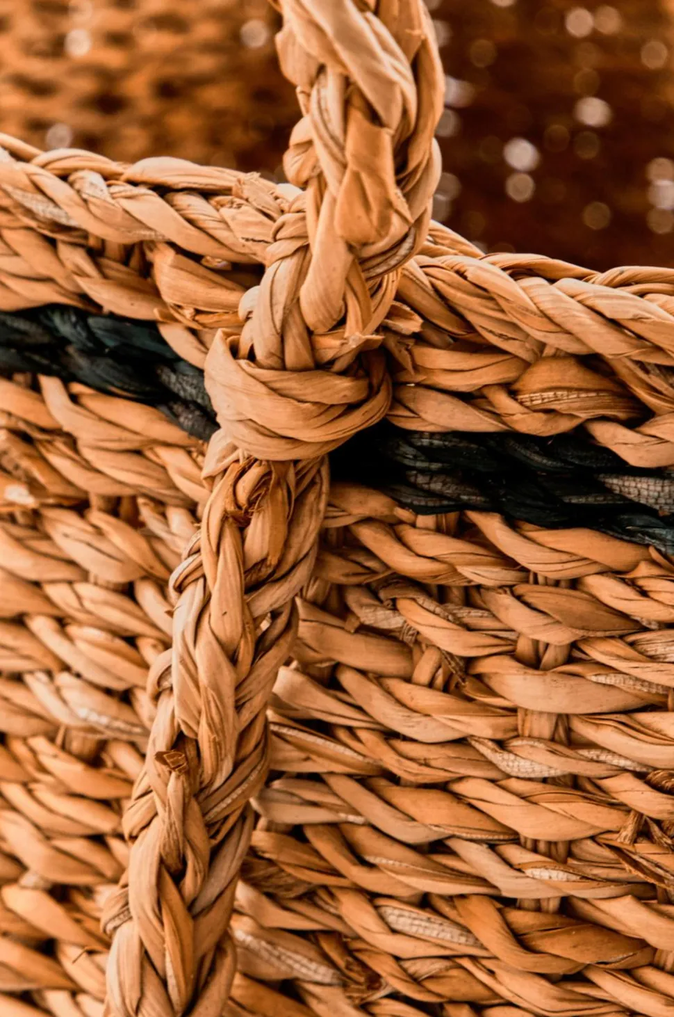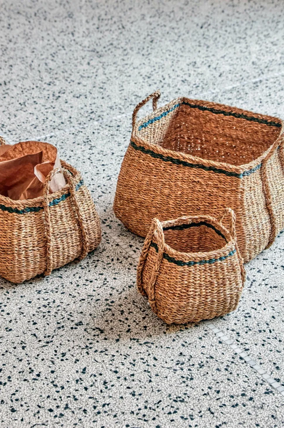 Hver kurv er håndvævet af robust havgræs og har bløde, naturlige nuancer og en iøjnefaldende sort stribe langs kanten, der fanger blikket. Deres robuste konstruktion og grebvenlige håndtag gør det nemt at rydde op i tæpper, legetøj eller vasketøj, mens de tre forskellige størrelser sikrer, at du altid har den perfekte pasform. Skab en hyggelig skandinavisk stemning ved at placere dem i din stue, entre eller soveværelse – både stilfuld opbevaring og indbydende detaljer. H: 30, 23,5, 19 B: 30, 23,5, 19 L: 40, 29, 19