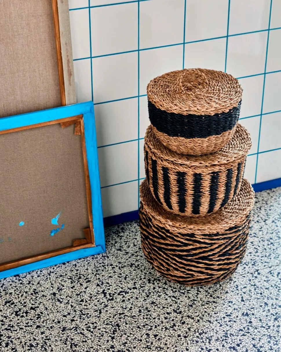 Tilføj naturlig karakter til dit hjem med dette sæt af tre håndlavede kurve af havgræs, hver med et tilpasset låg og slående sorte mønstre. De er perfekte til opbevaring af alt fra minder til håndværk og kombinerer iøjnefaldende grafik og bohemecharme for en alsidig stil. Løft stemningen i ethvert rum ved at udstille dem sammen eller hver for sig.