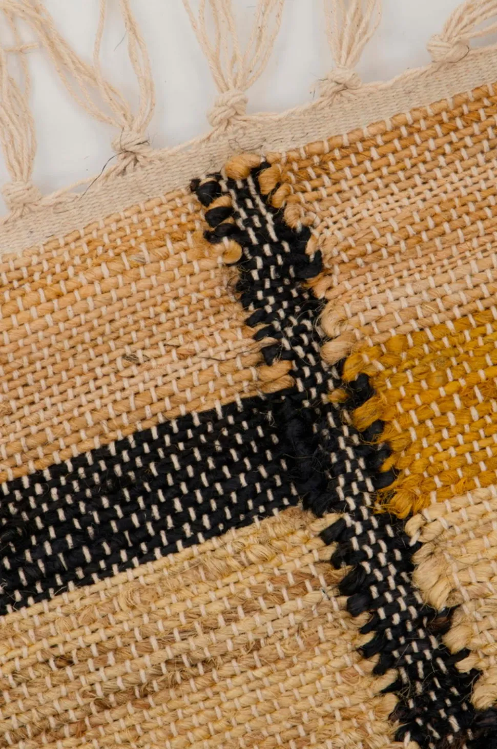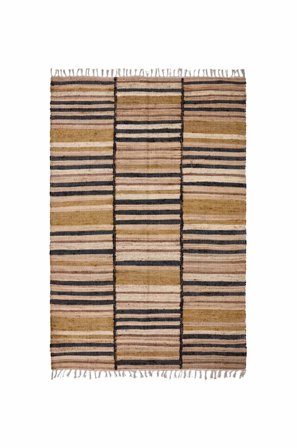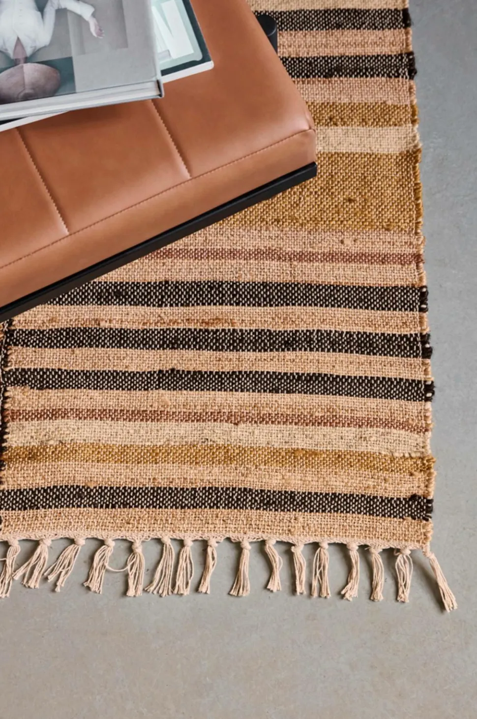 Dette tæppe er håndlavet af en blanding af jute og bomuld og har et fantastisk flerfarvet mønster i varme nuancer, som giver dit hjem et moderne og hyggeligt præg. De frynsede kanter giver et ekstra lag af stil, så det passer perfekt til din stue, under spisebordet eller i en rummelig gang. Perfekt til opholdsrum. Skab varme og charme i din indretning med dette smukke tæppe.
