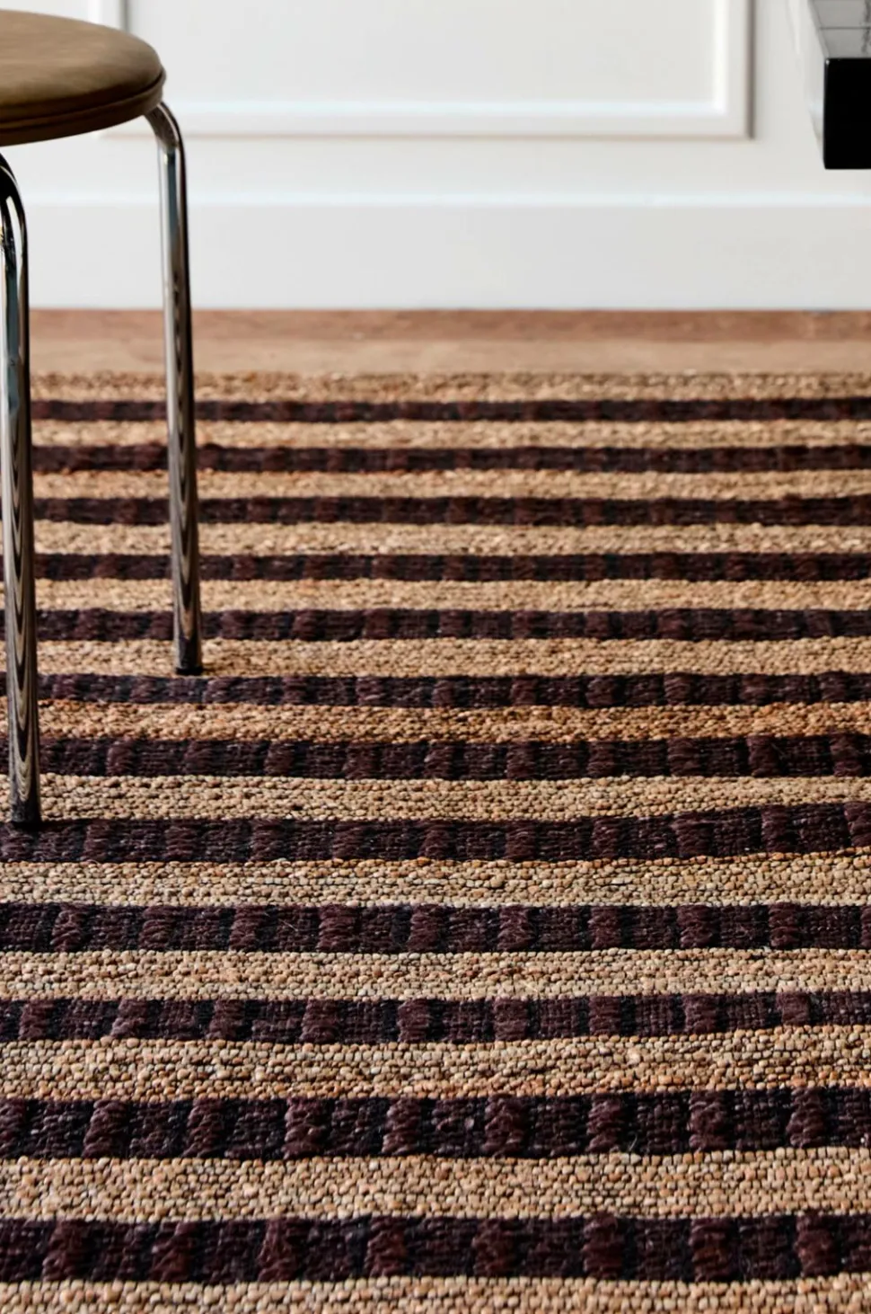 Dette håndlavede tæppe giver en taktil fornemmelse og varme til dit hjem med klassiske brune og naturlige striber. Den rige tekstur og de naturlige jutefibre gør det til et smukt statement under spisebordet, i entréen eller som et anker i din bolig.