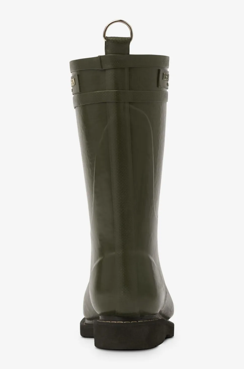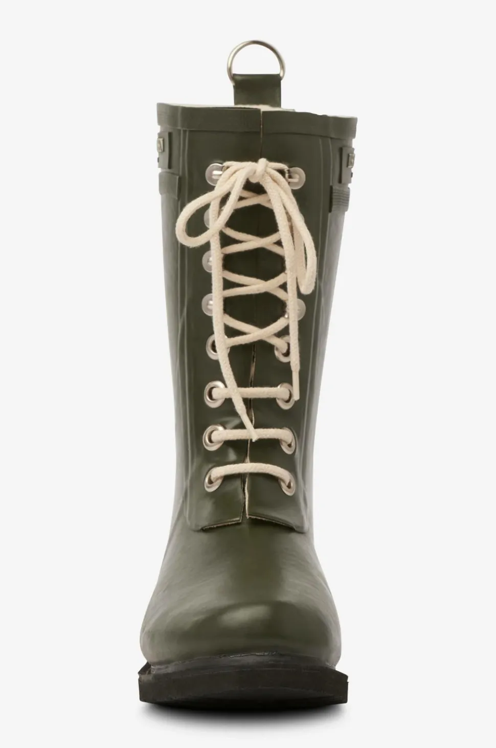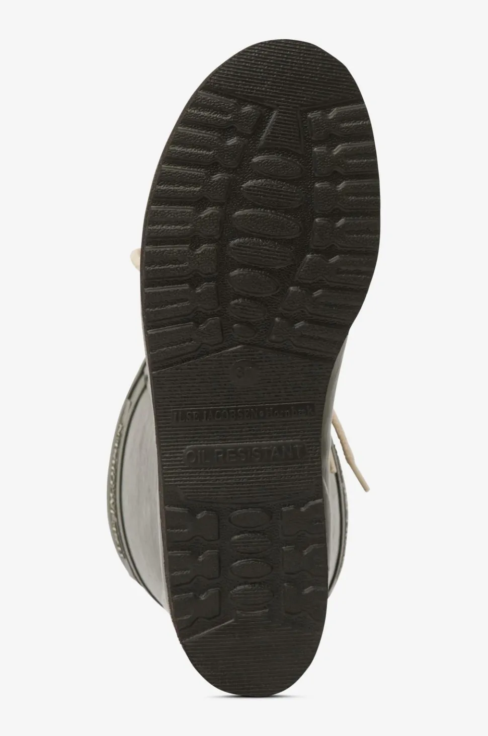 Trekvartlange, klassiske gummistøvler med snøre, fra Ilse Jacobsen, er luksuriøse og håndlavede i Europa. Snøren løber gennem sølvfarvede metalsnørehuller og hægter foroven. Skaftvidden kan justeres med snøren, bag snøren er der en hel, foldet kile. Støvlerne er fremstillet i PVC-fri gummi med blødt for. Indersålen er varmeisolerende. Flot formet ydersål i let, støddæmpende EVA med varmeisolerende egenskaber.