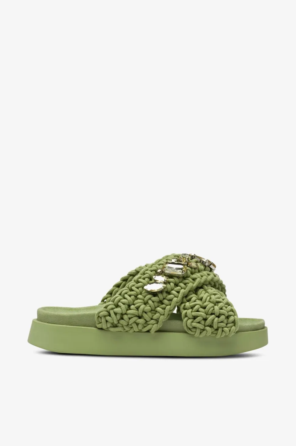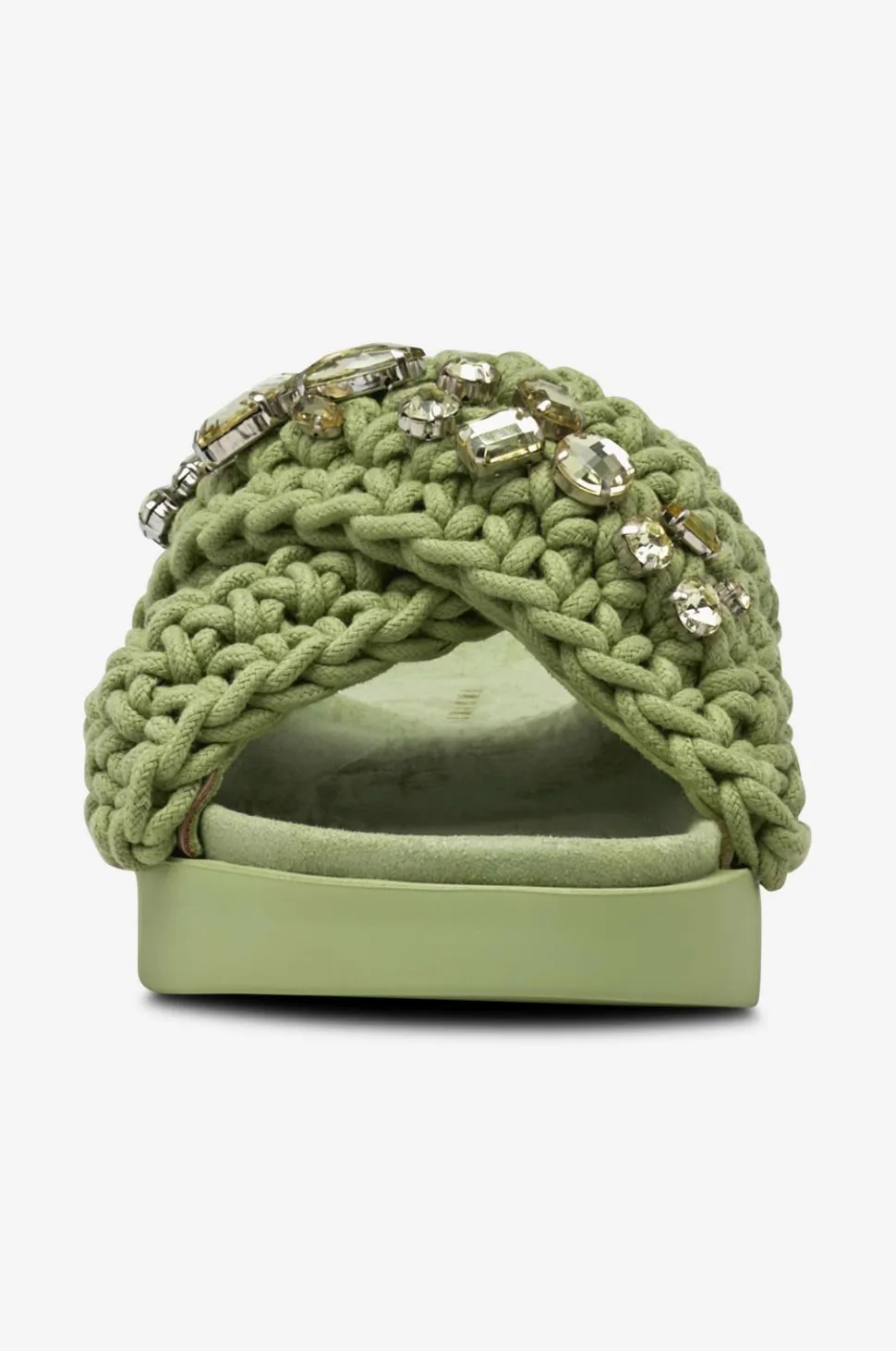 • Brede, krydsende remme i flettet tekstil med dekorative sten