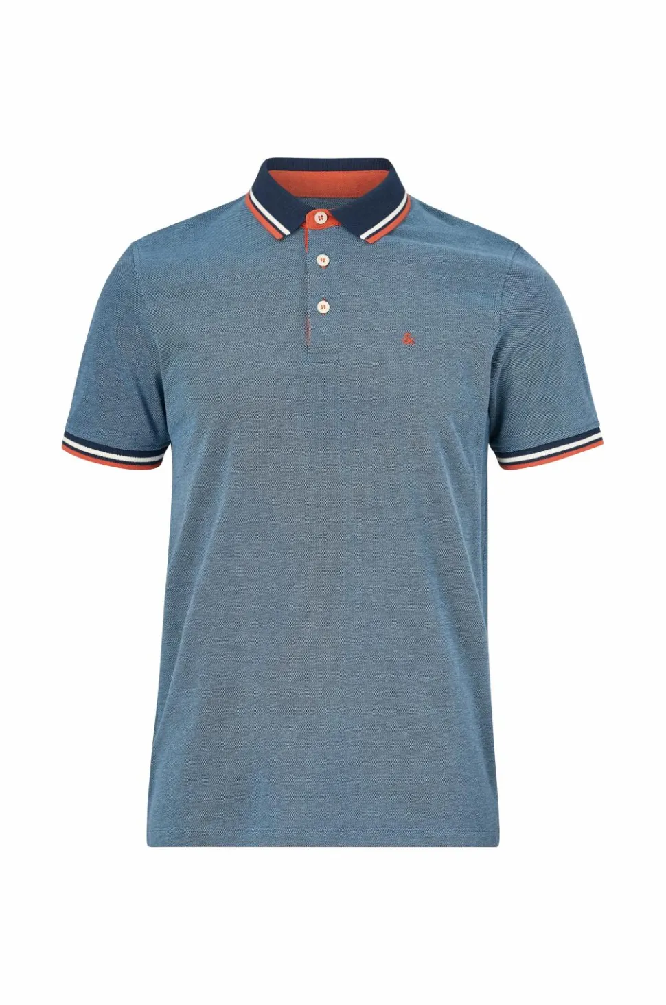 Poloshirt jjePaulos Polo SS fra Jack & Jones. Kortærmet pikéstrikket trøje med lille broderi på brystet og lille krave. Stolpelukning og kort ærme med lille kant i ærmet samt små slidser forneden i siderne. Længde foran ca. 70 cm og bagpå ca. 74 cm i str. M.