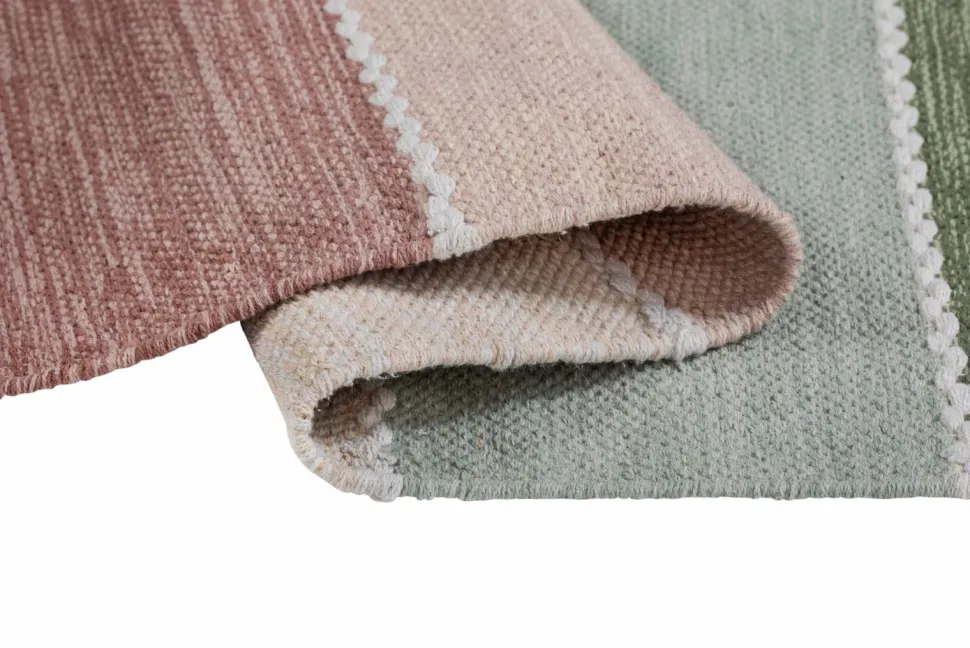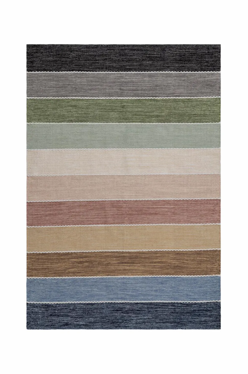 nyhamn multi er et stilfuldt håndvævet garntæppe med bløde pastelstriber, der giver et levende touch til ethvert rum. Farverne går gradvist fra mørkere nuancer i kanterne til lysere toner i midten, mens hvide sømme elegant fremhæver overgangene.