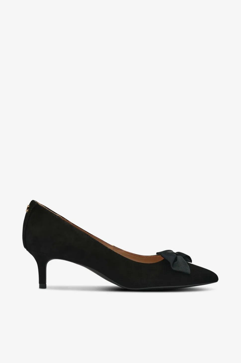 • Pumps i ruskind med bånd i tekstil foran