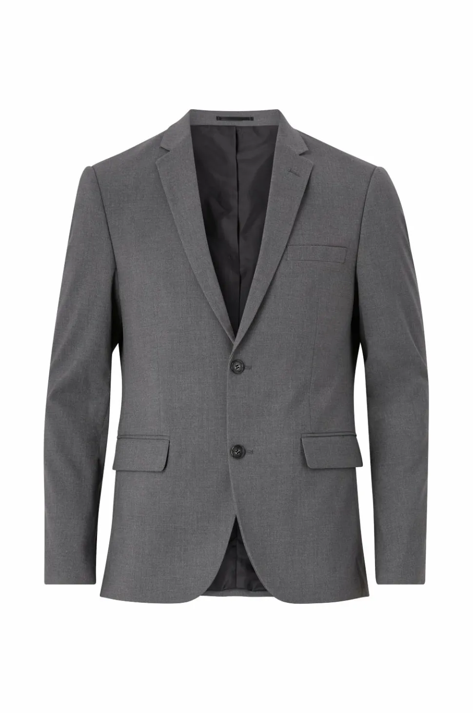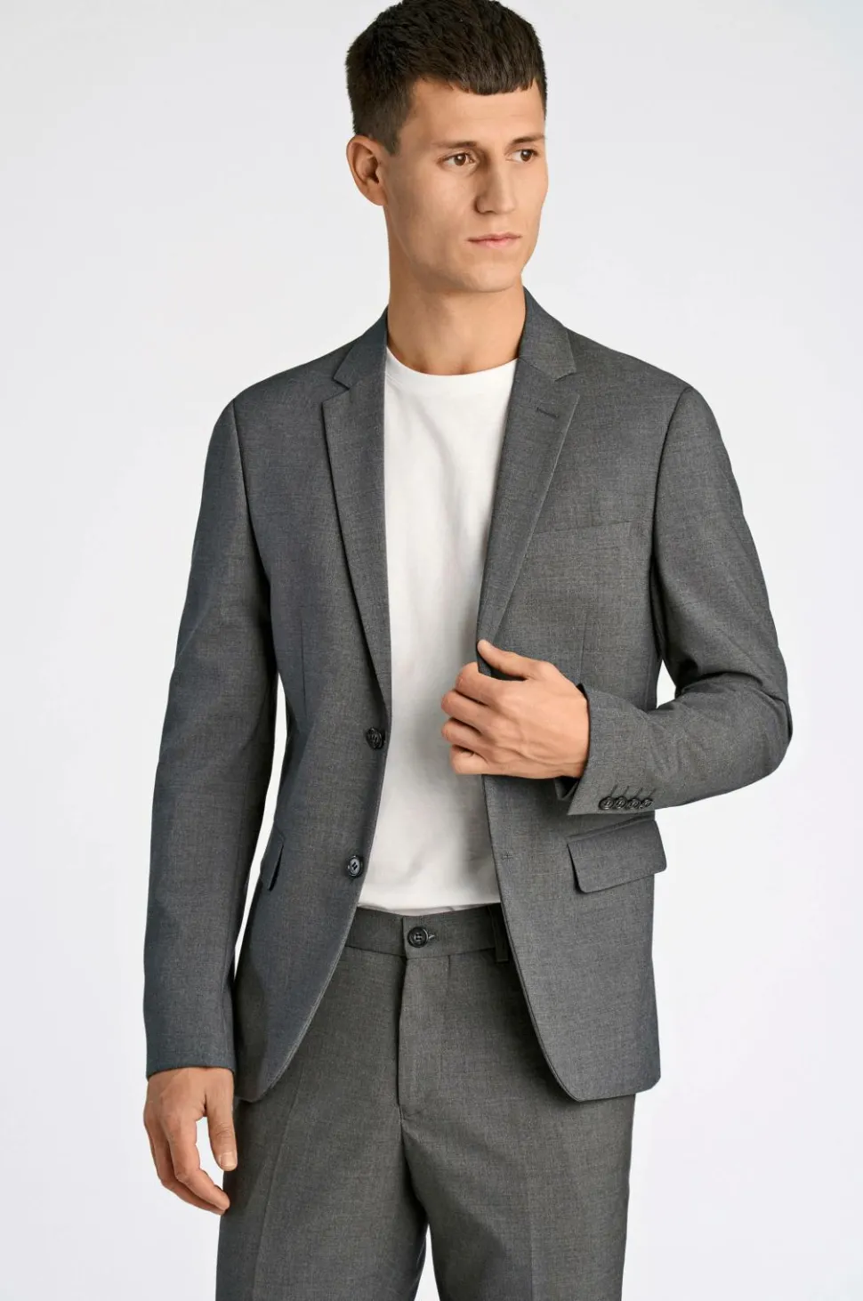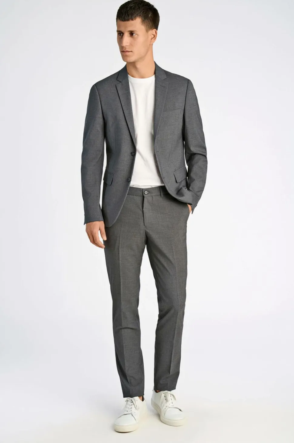 Jakkesæt fra Lindbergh med blazer og buks i klassisk model. Blazeren lukkes med to knapper og har fire pynteknapper i ærmekant. To lommer med lommeklap, en brystlomme og tre inderlommer. Let vatterede skuldre. Dobbelte slidser bagpå. Længde ca. 71 cm i str. M. Buksen har linning med to knapper, bæltestropper og gylp med lynlås. To lommer foran og to indsatte baglommer med knap. Benlængde ca. 82 cm i str. M.