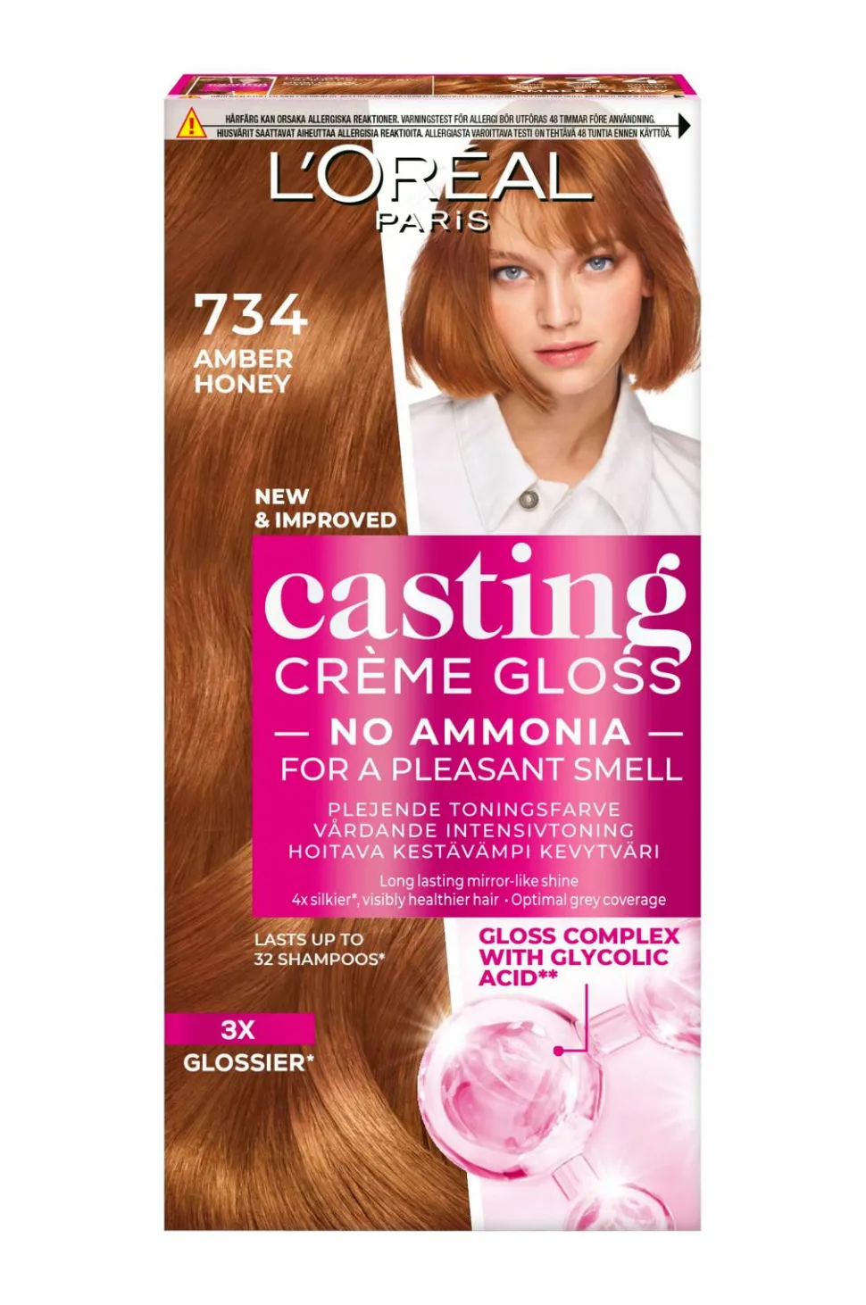 L’Oréal Paris Casting Crème Gloss er en semi-permanent hårfarve til alle hårtyper. Formlen er beriget med et gloss-kompleks med glykolsyre**, og resultatet er optimal dækning af grå hår og 3x mere glansfuldt samt 4x mere silkeblødt hår*.
