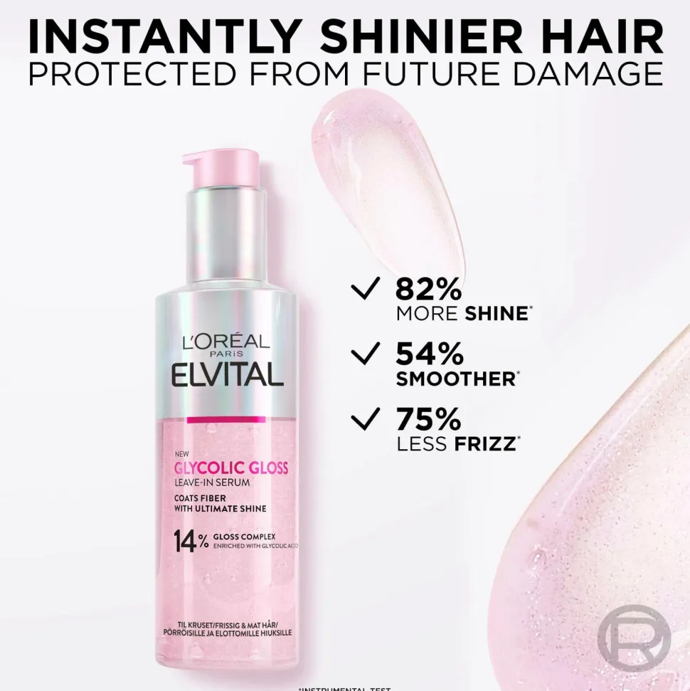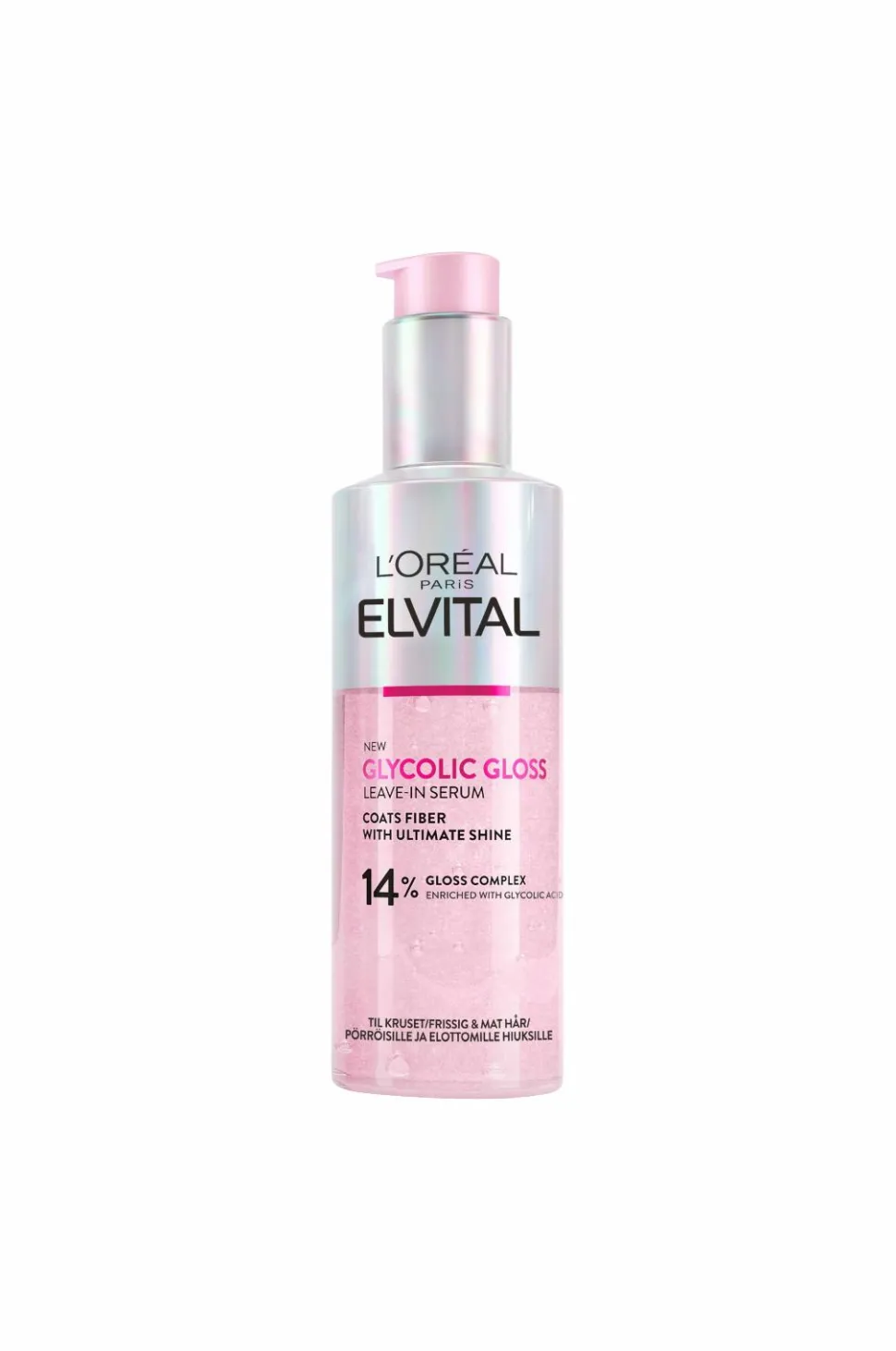 “L’Oréal Paris Elvital Glycolic Gloss Leave-In serum til kruset, mat hår forsegler hårets fibre og giver glans. Serumet forbedrer hårets glans med 82%*, gør det 54% glattere* og 75% mindre kruset*.