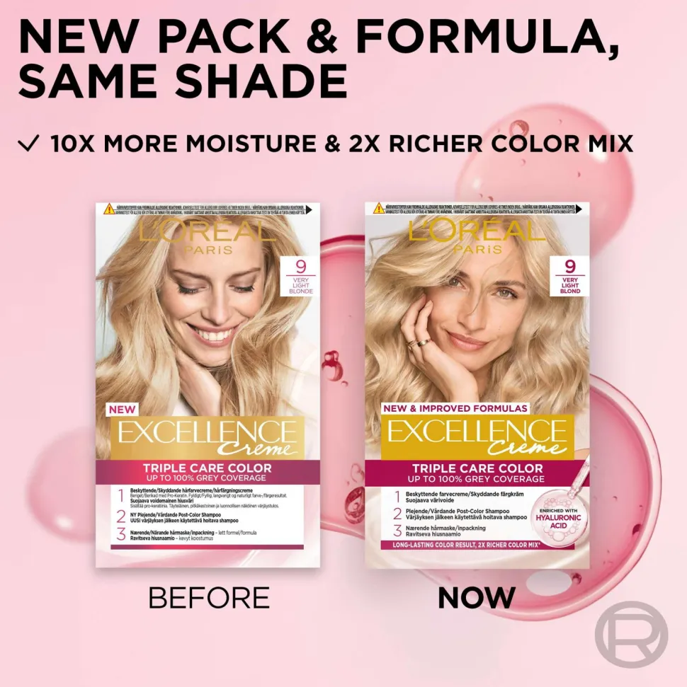 L’Oreal Paris Excellence Crème er en fantastisk permanent hårfarve, hvis du vil dække grå hår og samtidig beskytte og styrke dit hår. Excellence Crème-serien tilbyder klassiske og elegante farver, der giver fyldige, langtidsholdbare farveresultater. Triple Care Color-ritualet er beriget med hyaluronsyre og er et tretrinsprogram, der styrker og beskytter dit hår, samtidig med at det sikrer 10 gange mere fugt** og 2 gange rigere farveblanding* for en drypfri påføring. Op til 100 % dækning af gråt hår og velegnet til alle hårstrukturer.