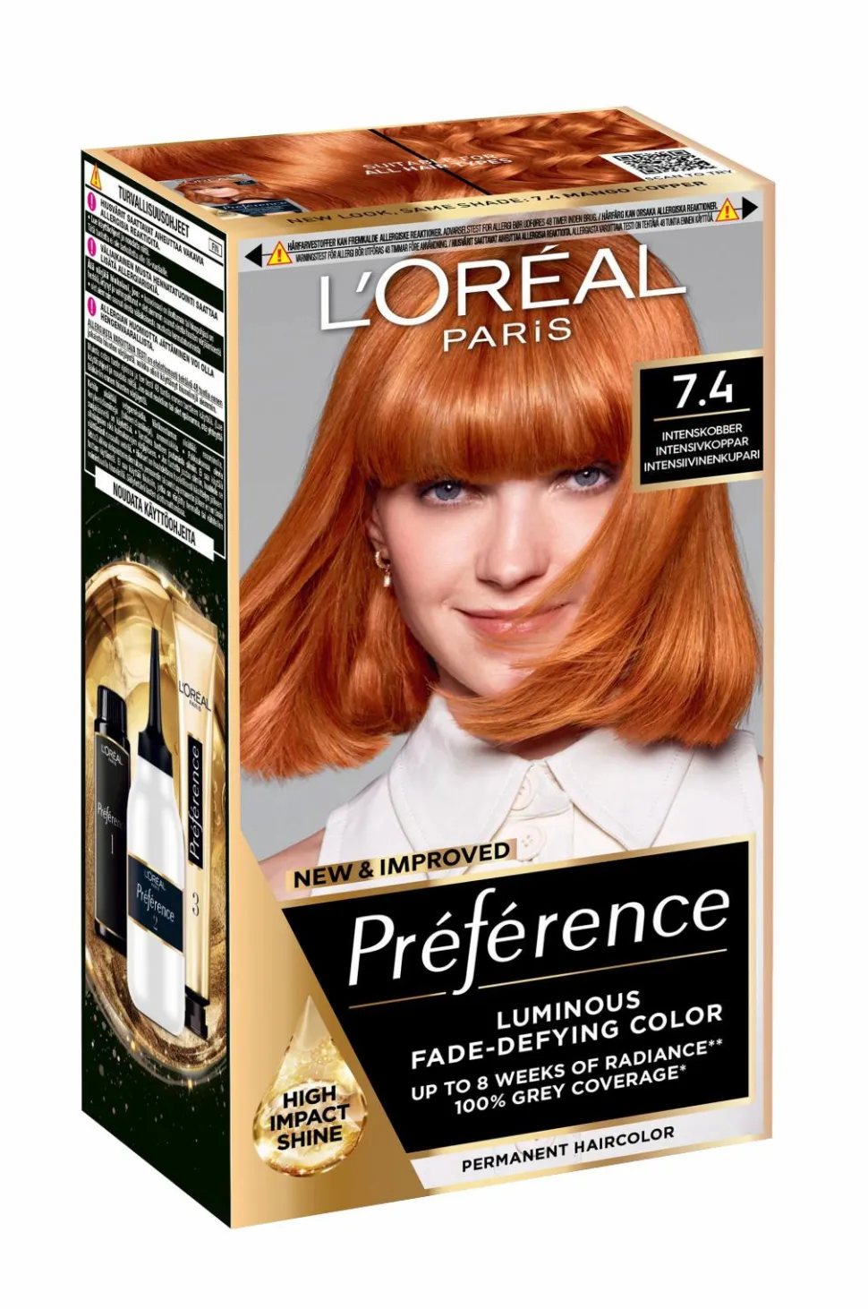 L’Oréal Paris Préférence 7,4 Mango Copper er en permanent hårfarge som passer til alle hårtyper og gir et skinnende blankt resultat. Formelen gir en strålende farge med fantastisk glans som bevares i opptil 8 uker**. Dekker grå hår 100 %.