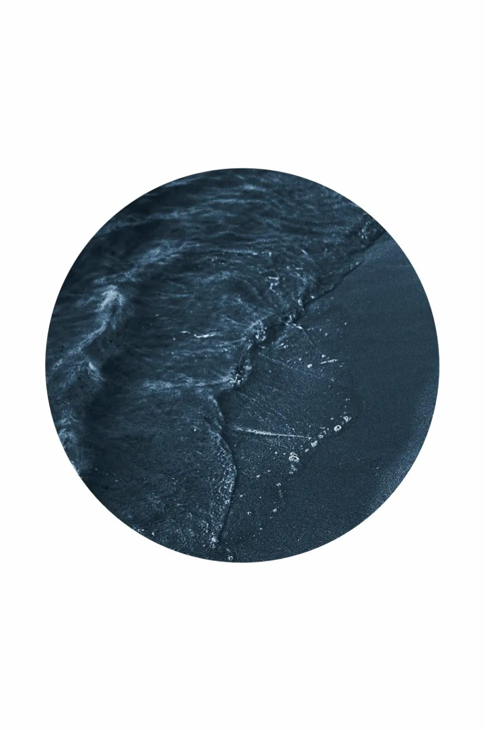 Billede Blue Beach fra Malerifabrikken. Print på rund MDF-plade. Når billedet er hængt op, gør profilen på pladen at fronten “svæver” ca. 0,5 cm fra væggen.