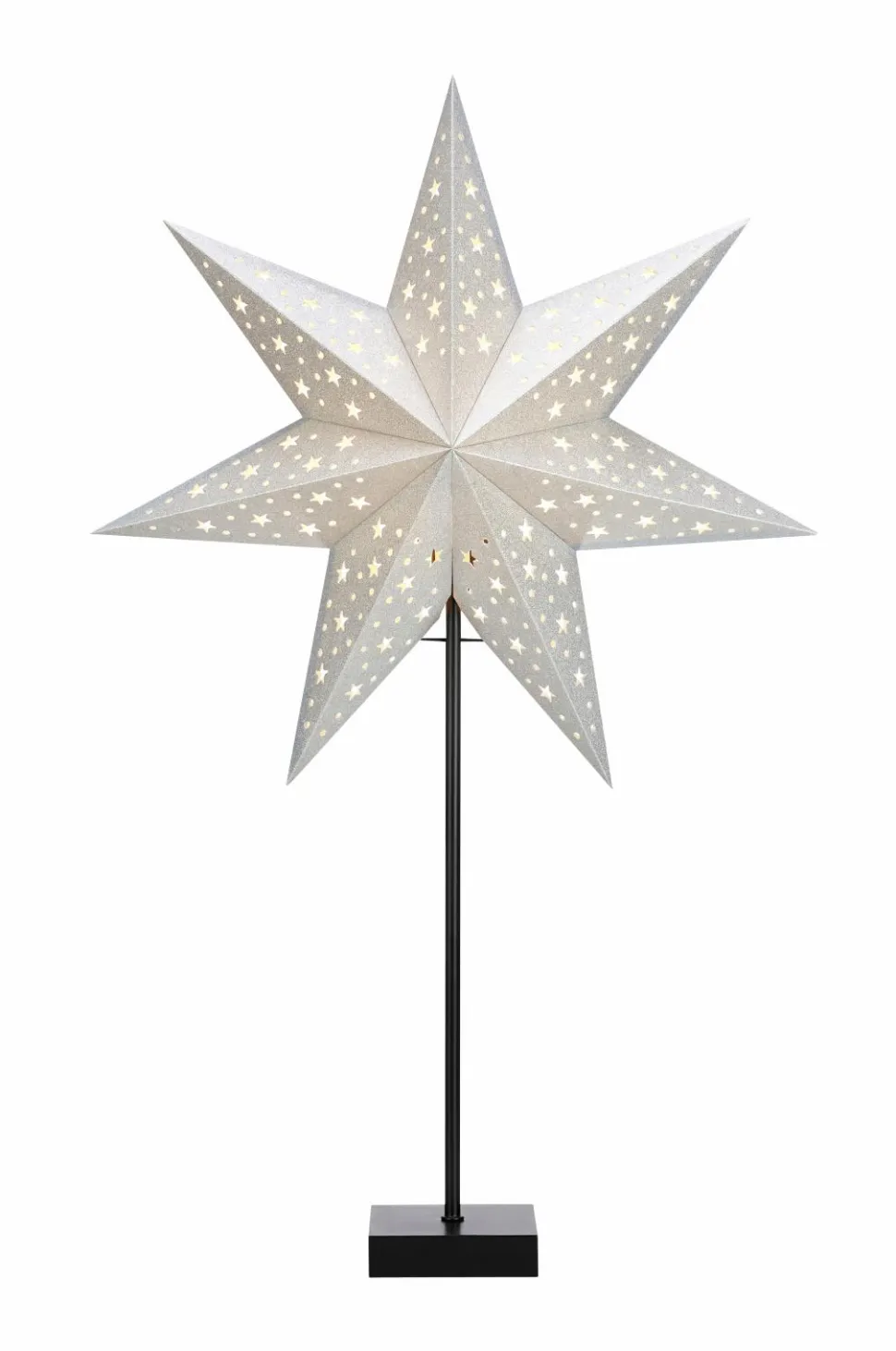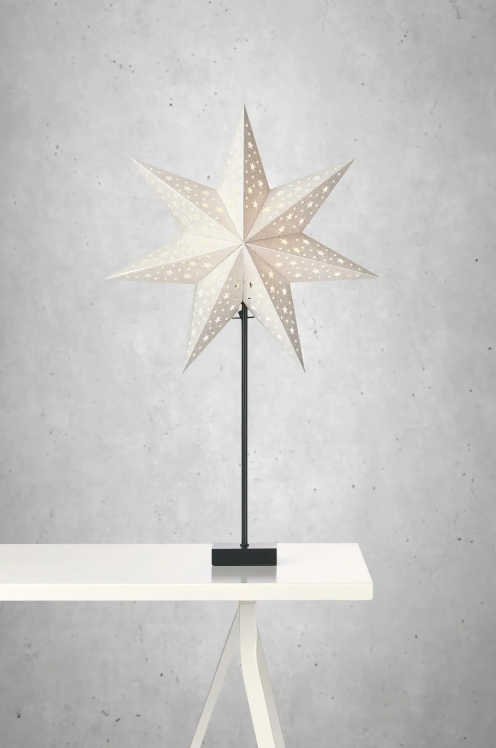 Solvalla Bordstjerne. Lampens fod i træ og metal, skærm af papir. Højde 69 cm, bredde 45 cm, dybde 21 cm. Bred lampefod 10 cm. E14-fatning, maks. 25 W. Ledningslængde 2 meter.