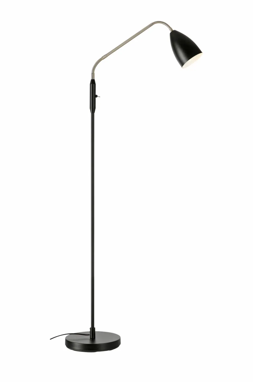 Patro Gulvlampe fra markslöjd. Skærm og base i metal. Justerbar, fleksibel arm i stål med indbygget kontakt. 3-trins dæmpbar led. 100% 450lm, 75% 225lm og 50% 135lm, farvetemperatur 3000k. 2 m tekstilkabel og vægstik. Højde 140 cm. Max 4,8w. Klasse ii. Udskifteligt led-modul sælges også som reservedel, led-modul 230v 4,9w 3-trins dæmpbart.