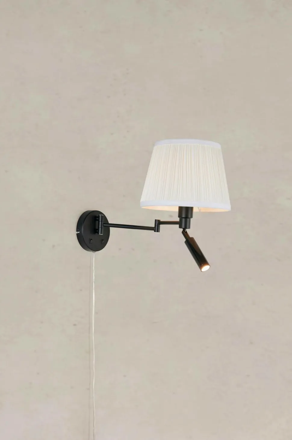 Pivot væglampe fra markslöjd. Væglampe i metal med to arme – en svingarm med tekstilskærm og justerbart led-læselys til retningsbestemt belysning. Tekstilskærmen har en diameter på 25 cm og giver en behagelig glød. Monteret med beslag. Integreret samledåse i vægpladen giver mulighed for nem tilslutning til fast elinstallation. Klasse ii. 1xe27+led, maks. 40w, 4w. E27-lyskilde medfølger ikke.
