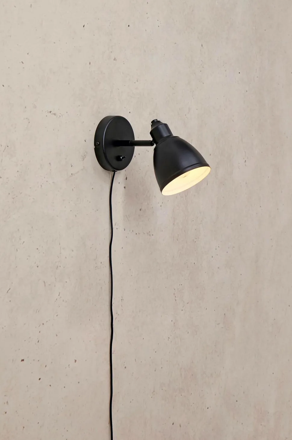Story væglampe fra Markslöjd. Base og skærm i metal. 2 m kabel med stik. Afbryder på vægpladen. Monteres med bøjle. 1xE14, maks. 40 W. Pære medfølger ikke.