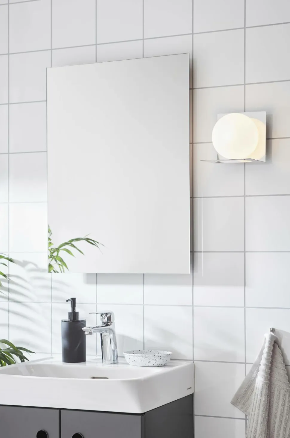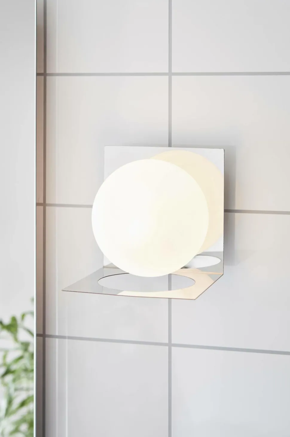 Væglampe godkendt til badeværelser. Hvid matteret glaskuppel på en base i forkromet metal. Til fast installation. Maks. 1x18W. G9-fatning (medfølger ikke). 14 cm bred og høj.