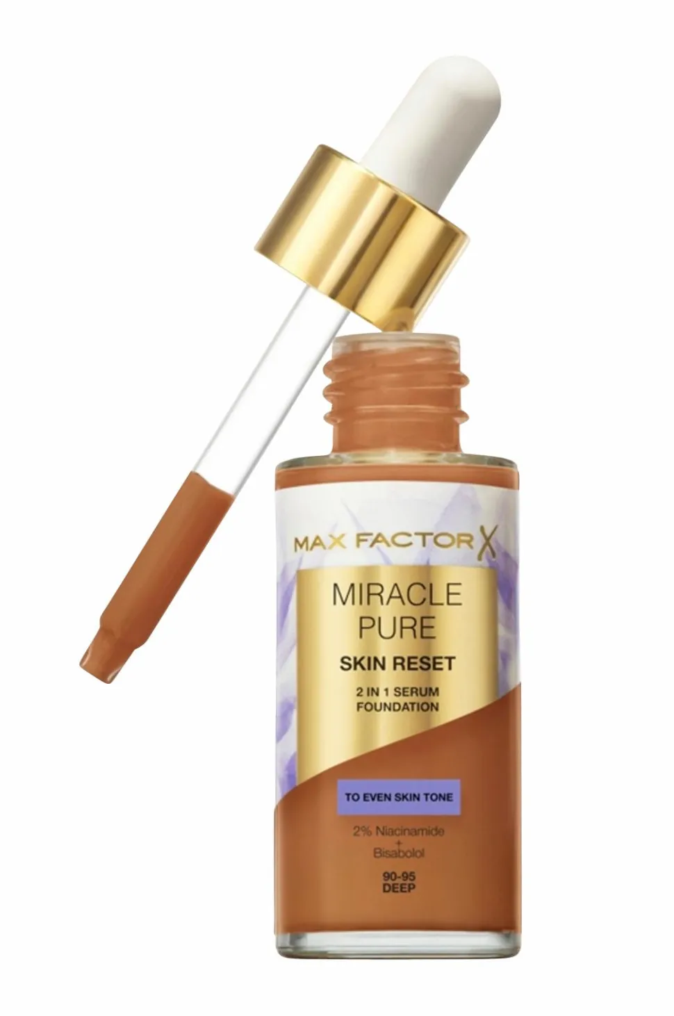 Ready.Reset.Go med Max Factor Miracle Pure 2in1 Skin Reset. En 2-i-1-serumformel kombineret med foundation, der giver øjeblikkelig perfekt dækning og en mere jævn hudtone.