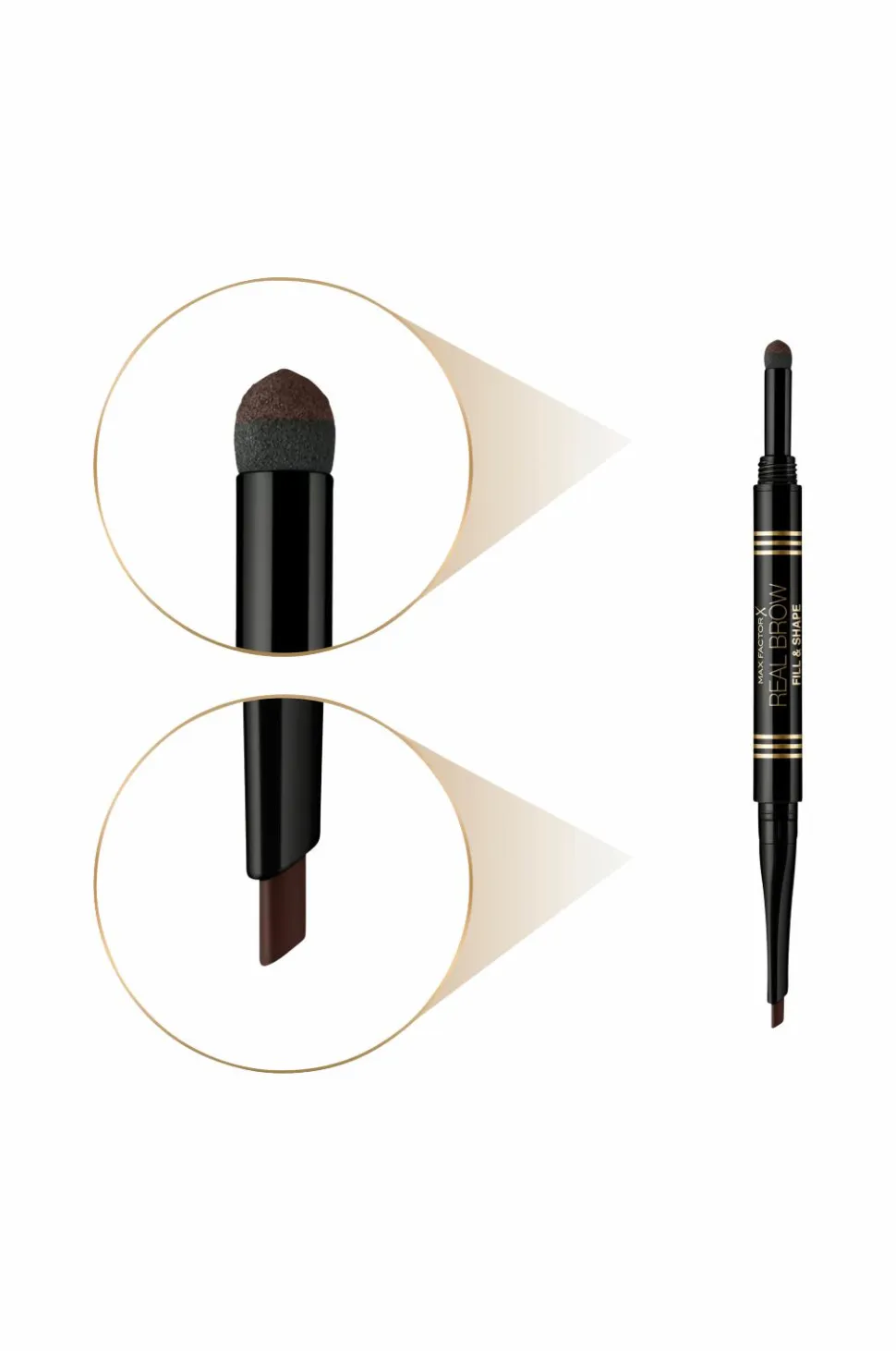 Real Brow Fill & Shape fra Max Factor er en perfekt brynduo som hjælper dig med at skabe naturligt fyldige bryn. Brynpennen har en twist up-funktion og er let at arbejde med. Den dobbeltsidede brynpen bruges i to trin, hvor den vinklede pen bruges til at definere og forme dine bryn, mens pudderapplikatoren toner og fylder tynde områder – for et naturligt brynlook.