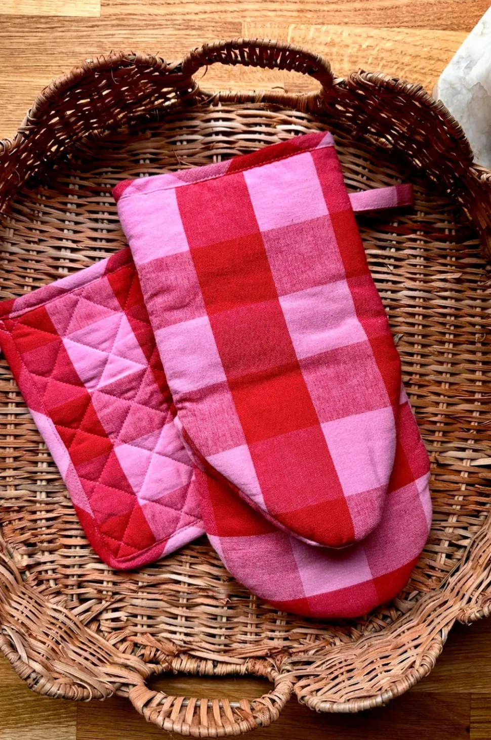 Grydelap i bomuld fra det svenske mærke Midnatt. Paola er et stof med ternet mønster.