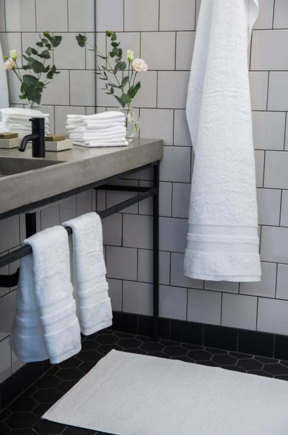 Badeværelsesmåtte i stonewashed bomuldsfrotté med indvævet bort i en ramme. Oeko-Tex Standard 100