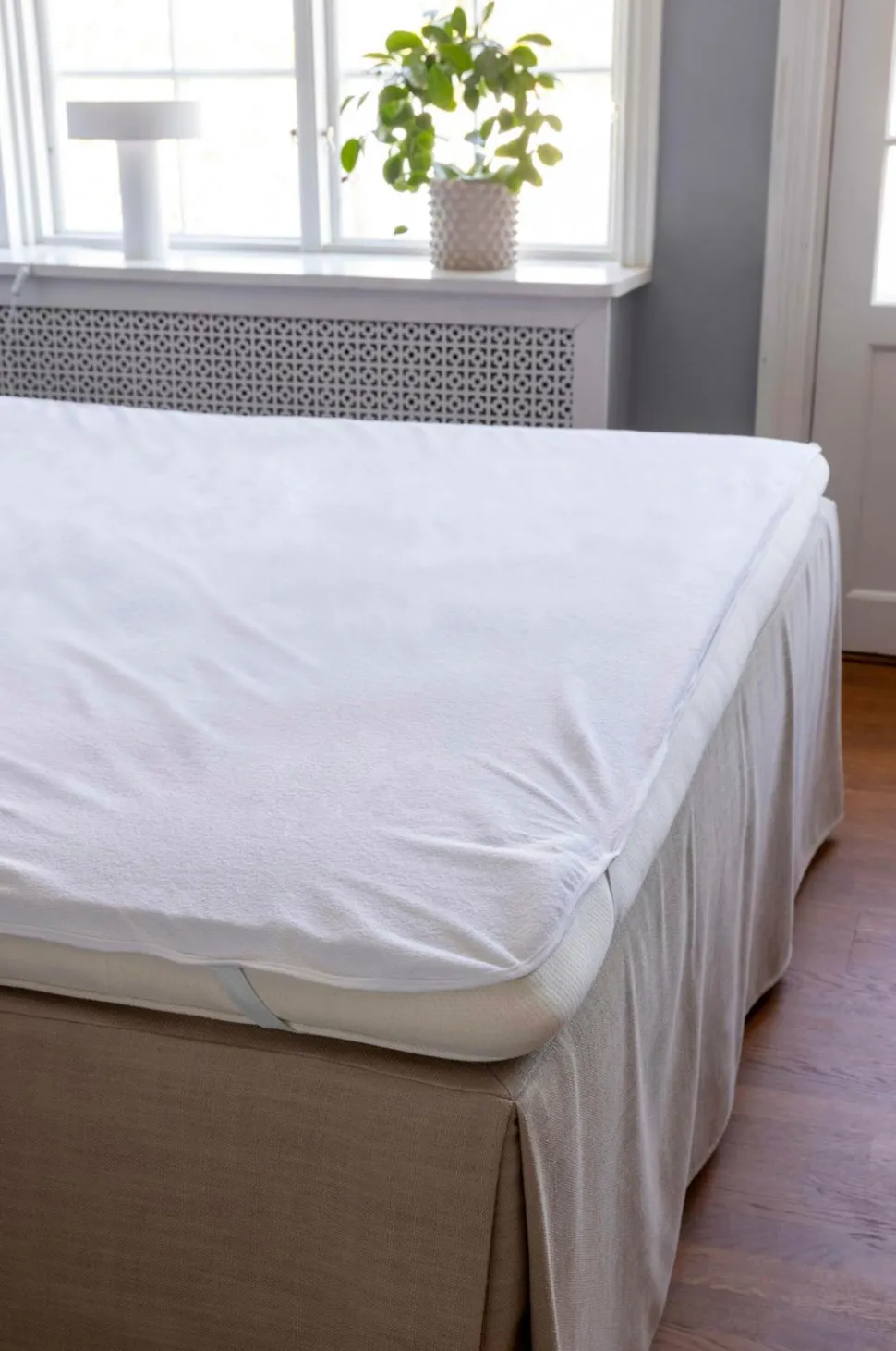 Madrasskåner i polyuretanbehandlet, lækagetæt bomuldsfrotté. Minimal varmeafgivelse. Syet med elastikbånd i alle hjørner. Støvmidetæt. Fremstillet i Portugal. Vaskes på 60°. Hængetørres. Må ikke tørretumbles.