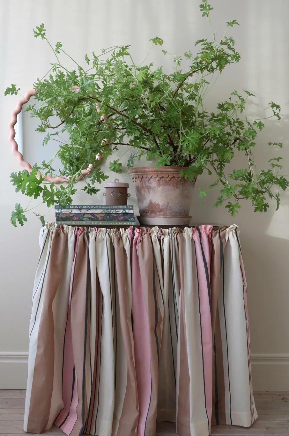 Ekstra bredt Bistro-gardin i håndvævet, stribet bomuldsstof. Gardinet er skræddersyet med en lomme, der passer til en lille gardinstang, og har en lille rynke i toppen. Gardinet er lavet af 3 stykker håndvævet stof, der er sat sammen, har rå kanter og en dobbelt fold i bunden. Kanten forneden har også en åbning i hver side, så gardinet kan bruges som spændegardin i vinduer, på døre eller skabe. Stoffet er håndvævet og vil have uregelmæssigheder i både tykkelse, tråde og farve.