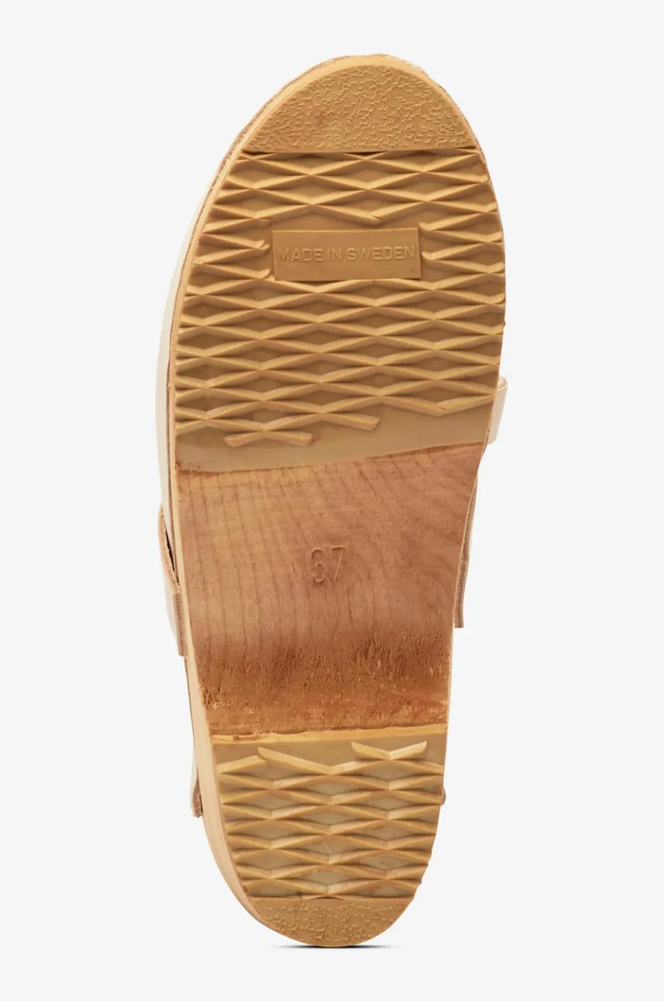 – Træbunden er fremstillet af ét stykke knastfrit elletræ i de samme lokaler, hvor træskoene produceres.