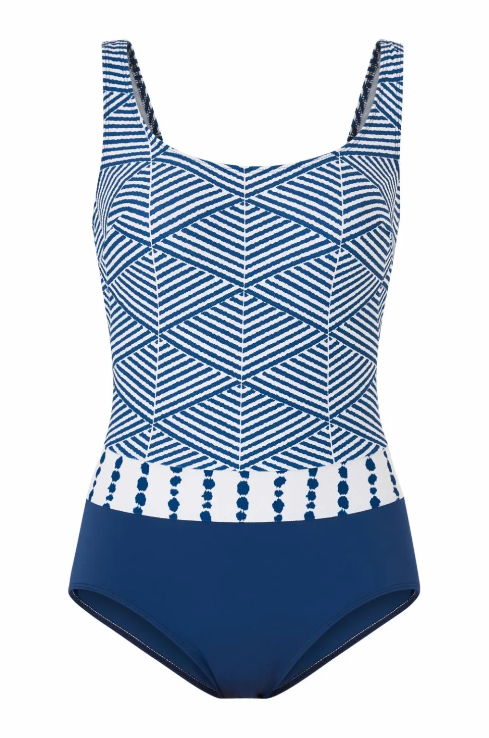 En badedragt, der på slående vis kombinerer to forskellige mønsterprint med ensfarvede farver.