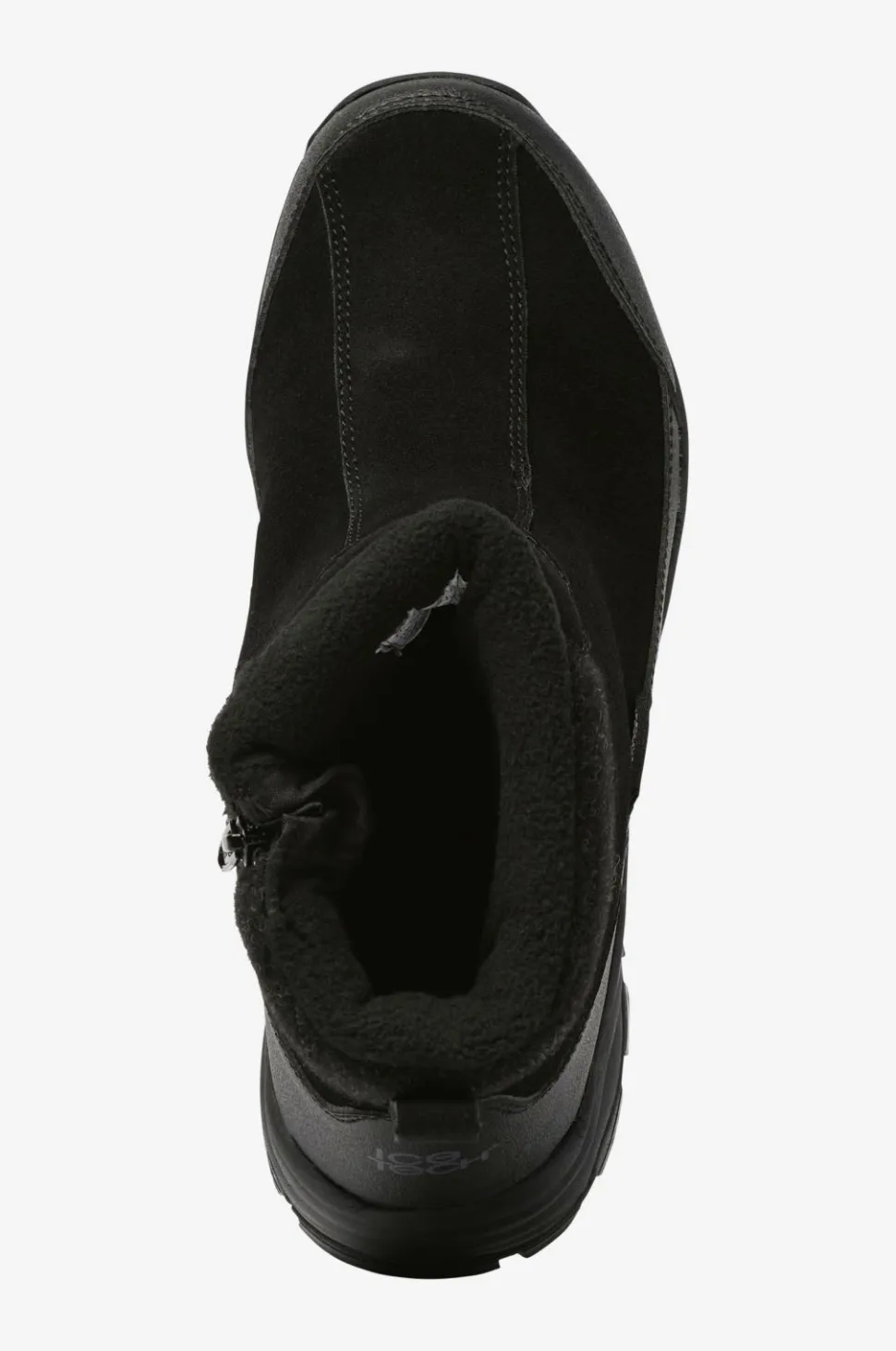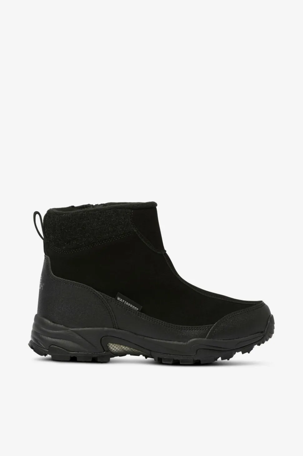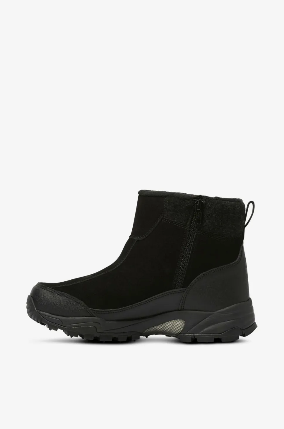 Varmforede vinterstøvler i slidstærk imiteret ruskind med forstærkninger i imiteret skind. Lynlås med tekstilkile i siden. Varmende for i blød fleece med god åndbarhed. Ydersålen har dupper, både i plast og i metal, for at give et så godt greb som muligt på vinterunderlag. Trækstrop bagpå.