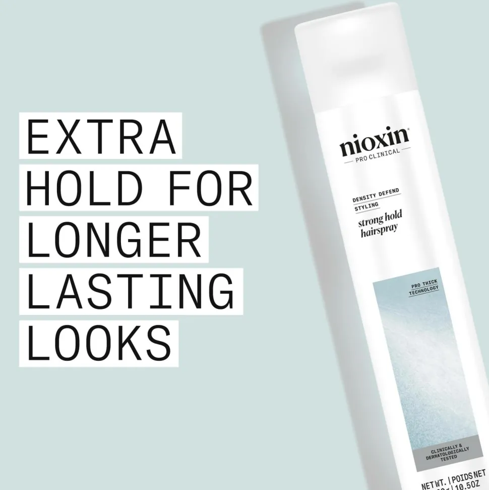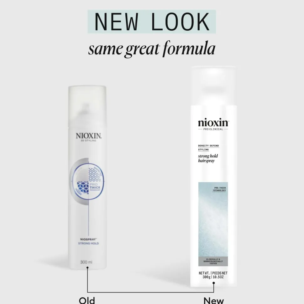 Nioxin Strong Hold Hairspray er en fast, afsluttende hårspray med ekstra hold, der giver et længerevarende look. Denne hårspray er formuleret med ProThick-teknologi og er fugtbestandig, nem at børste ud og hjælper med at beskytte hårets tæthed med mikrobindinger, der giver et fast, men skånsomt hold i håret. Hjælper med at opnå længerevarende styles og er velegnet til alle hårtyper, men perfekt til mellemgroft til groft hår.