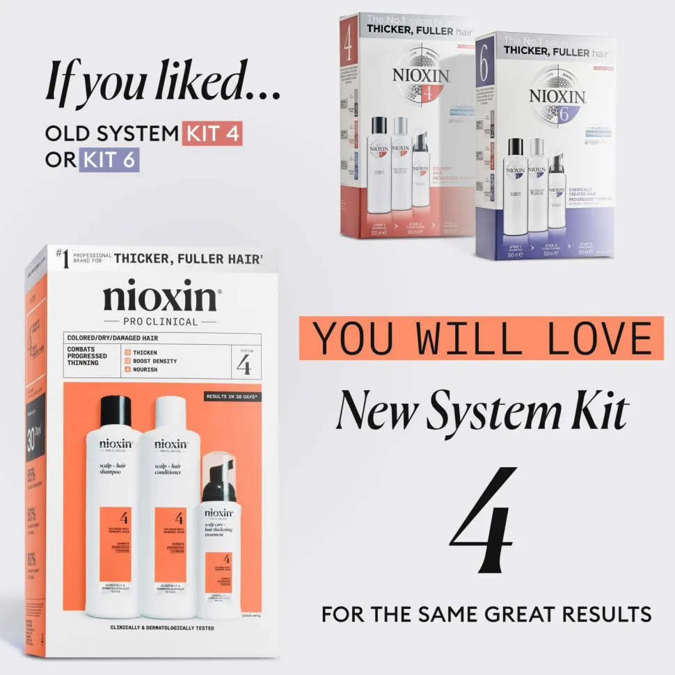Nioxin System 4 Trial Kit er en hårpleje system til farvet, tørt og beskadiget hår med fremskreden udtynding. Dette unikke sæt af tre professionelle hårprodukter, der er baseret på en avanceret hudplejetilgang, er specielt formuleret som en hårfortykkende behandling, der giver fyldigere hår og farvebeskyttelse. Nioxin System 4-kuren reducerer hårfald på grund af brud, styrker håret og giver en sund glans til farvebehandlet hår, samtidig med at hovedbunden opfriskes. Nioxin Cleanser Shampoo fjerner snavs, overskydende olie og andre miljømæssige rester fra hovedbunden og håret. Nioxin Scalp Therapy Conditioner er en letvægtsbalsam, der hjælper med at give håret modstandskraft, samtidig med at den fugter hovedbunden og håret fra rod til spids. Nioxin Scalp & Hair Treatment opfrisker hovedbunden og hjælper med at give tykkere hår ved at øge fylden i hvert hårstrå. Den nye Nioxin System 4 Trial Kit er en kombination af den gamle Nioxin System 6 Kit og Nioxin System 4 kit. Den nye System Kit 4 er velegnet til tørt, skadet og farvet hår og er målrettet mod fremskreden udtynding. Hvis du tidligere har elsket Kit 6, vil du elske den nye Kit 4. Det er klinisk bevist, at kit reducerer hårfald på grund af brud med op til 91 %**.
