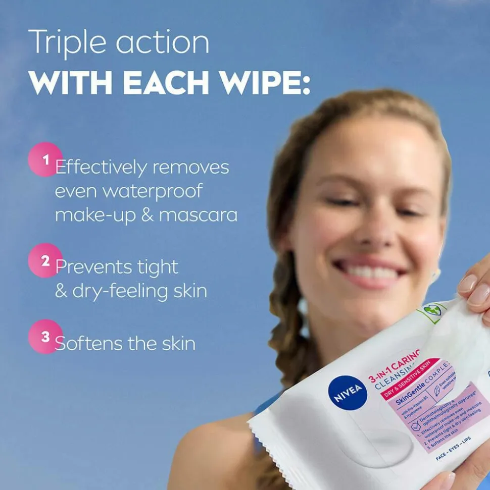 NIVEA Gentle Cleansing Wipes er udviklet til tør hud. Disse bløde, plantebaserede renseservietter er biologisk nedbrydelige og plejer tør hud. Den milde formel med 0% alkohol og ædel mandelolie vil ikke kun rense dit ansigt grundigt og fjerne vandfast makeup og mascara, men også fugte din hud. Dermatologisk testet. Velegnet til alle hudtyper, også tør hud.