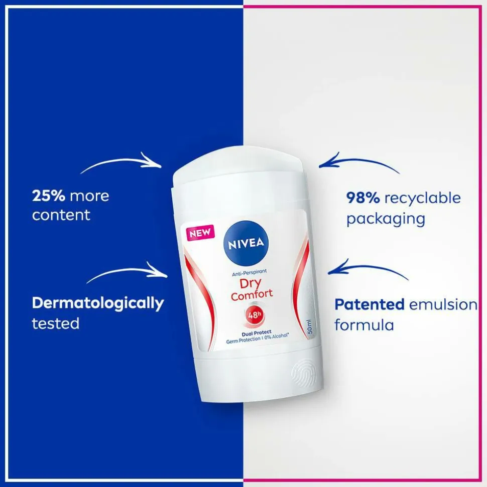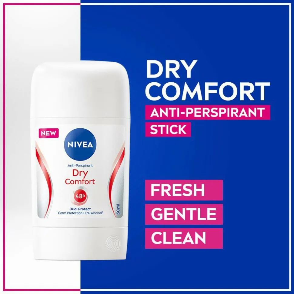 Med sin nye patenterede emulsionsteknologi tilbyder NIVEA Dry Comfort Stick 48 timers pålidelig beskyttelse og en jævn påføring. Oplev en deodorantstick, der giver en ekstra frisk og ikke-klæbende hudfornemmelse, der passer til alle hudtyper. Dual protect-formlen indeholder to aktive antiperspirantstoffer for stærk svedbeskyttelse. Den dermatologisk testede og ethylalkoholfri formel er skånsom mod din hud. Oplev den nye og moderne emballage, der er designet til en mere intuitiv brugeroplevelse. Den giver 25 % mere indhold og sparer 17 % plastik (pr. ml sammenlignet med den tidligere NIVEA Deostick-emballage).