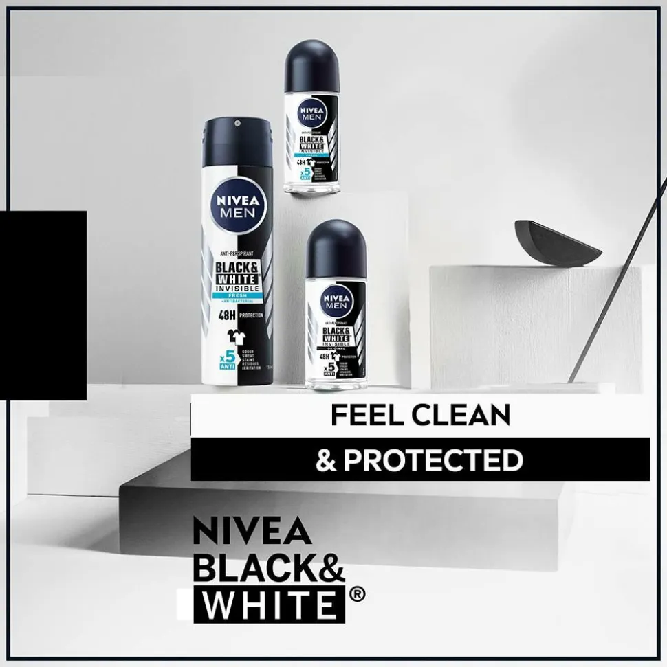 NIVEA MEN Black & White Invisible Fresh antiperspirant deodorant forhindrer hvide mærker på mørkt tøj og gule pletter på lyst tøj. Den unikke formel giver dig en frisk følelse og beskytter dig i 48 timer mod sved og kropslugt men er samtidigt skånsom mod din hud. Desuden beskytter antiperspiranten dig mod lugt, sved, pletter, rester og irritationer. Dermatologisk testet.
