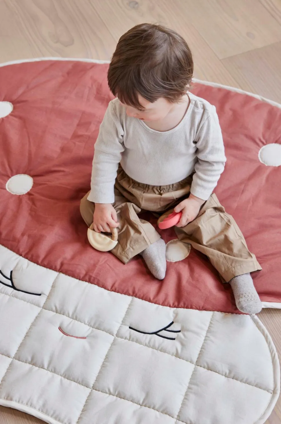 Det quiltede tæppe mushroom kombinerer komfort og finurlighed med sit charmerende design og materialer af høj kvalitet. Tæppet er fremstillet af 100 % økologisk bomuld og fyldt med 100 % microsoft polyesterfibre, så det føles hyggeligt og blødt. Med kraftige syninger for holdbarhed og et smukt broderet mushroom ansigt tilføjer det et legende og dejligt element til ethvert børneværelse.