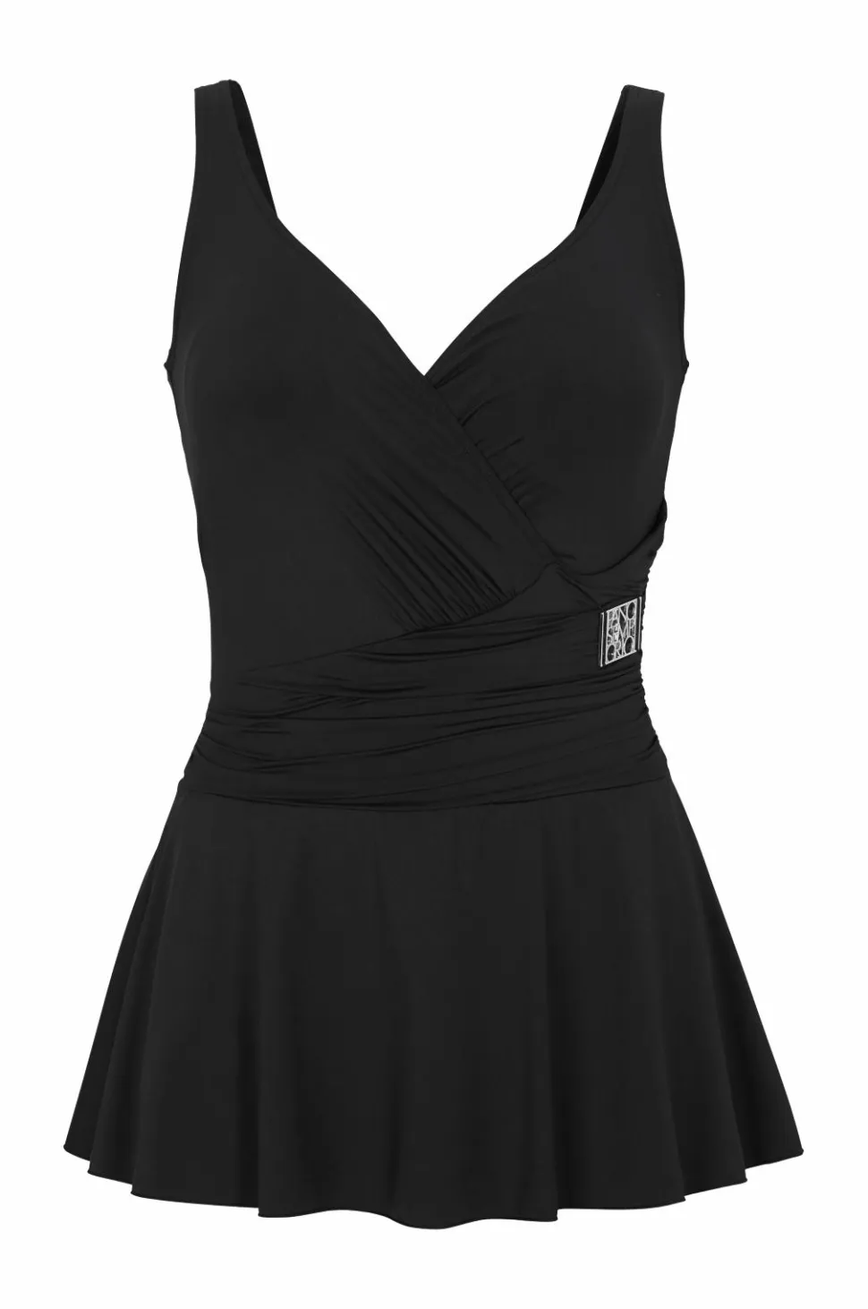 Badedragt Venezia fra Panos Emporio i flatterende model med skørt og drapering foran i taljen. Slå-om snit foroven der er fastgjort foran ved halsen og med formpressede skåle med blød elastikkant forneden. Afskæring bagpå i taljen og metalsmykke foran i den ene side. Foret skridt. Længde fra skulderen ca. 62 cm i str. M.