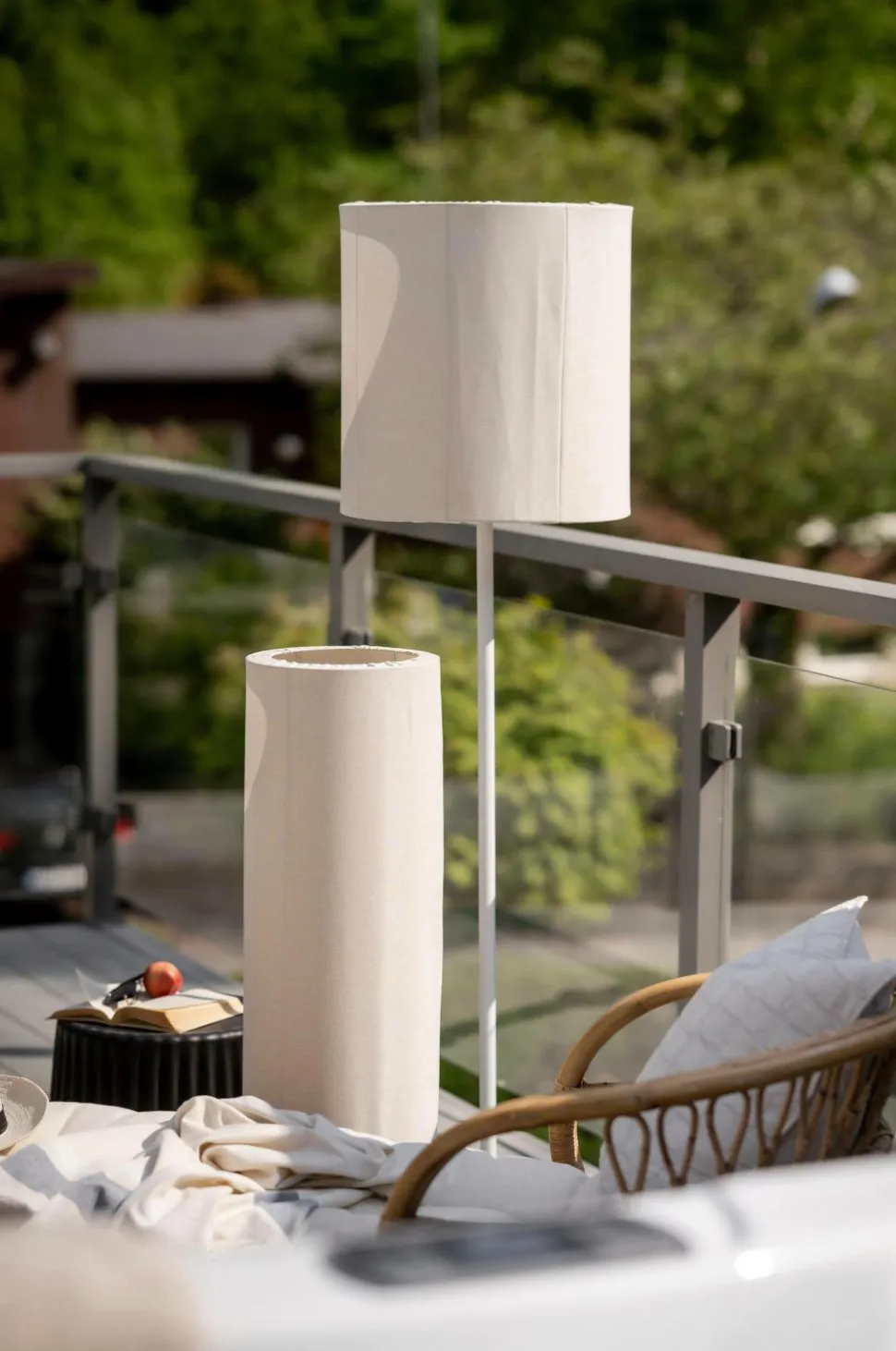 Agnar Gulvlampe til udendørs brug. Lampeskærmen er lavet af et stof af 100% akryl dralon, der kan tåle at være udendørs i al slags vejr. Stoffet har en melangeeffekt med høj lysægthed (5-7). Vand- og smudsafvisende teflonbehandling. Lampeskærmens ramme er galvaniseret. Basen har en e27-lampeholder. Over lyskilden og lampeholderen er der et plastlåg og en pakning, som beskytter mod fugt. Lampeskærmen er fastgjort til lampefoden ved hjælp af et særligt beslag. Lampefod og lampeskærm sælges kun som et sæt med fod og skærm.